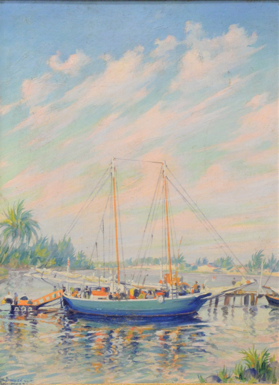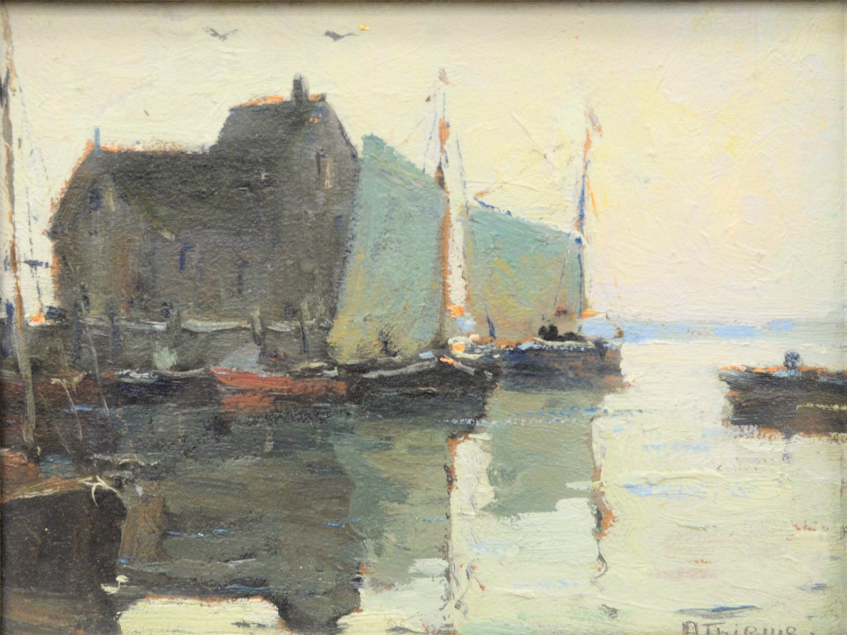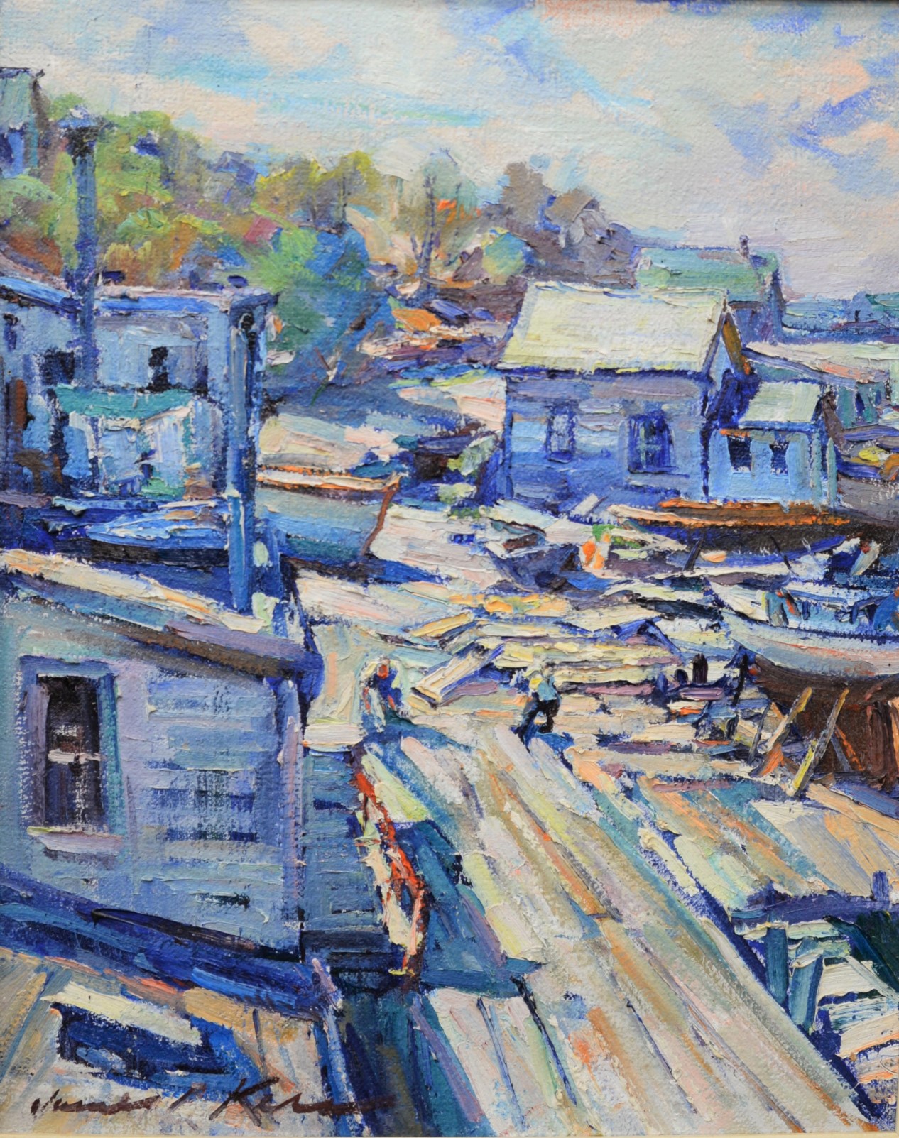 label on back with artist name and title, “Venetian Boats, William Gedney Bunce to East Washington Square to New York”, on cribbed board, 14″ x 17″.