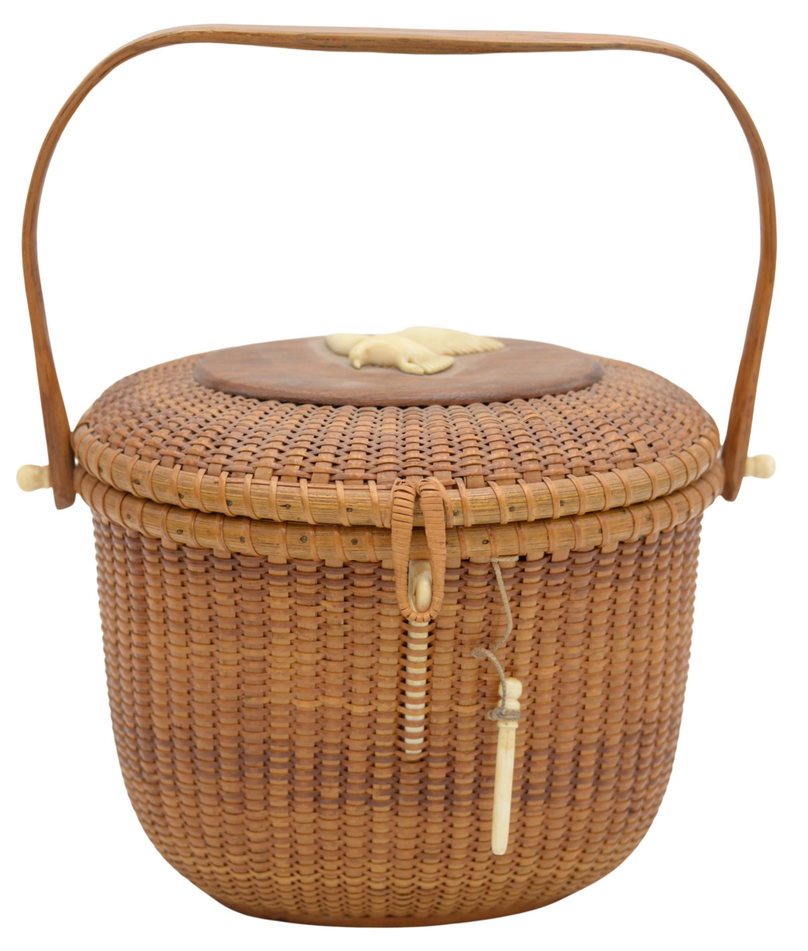 Jose Reyes Nantucket Friendship Basket/Purse, having carved bird on top with swing handle, signed and marked “Made in Nantucket, Jose Formoso Reyes”, total height 10 3/4 inches.