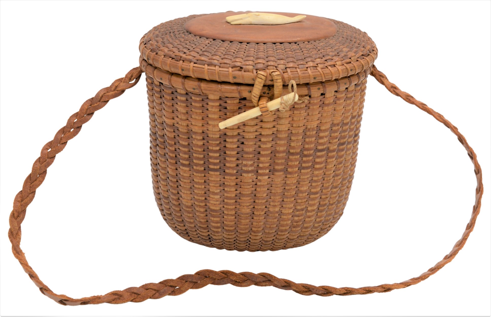 Jose Reyes Nantucket Friendship Basket/Purse, having carved whale on top, along with braided leather shoulder strap, signed and marked on bottom “Made in Nantucket, Jose Formoso Reyes”, height 7 inches.