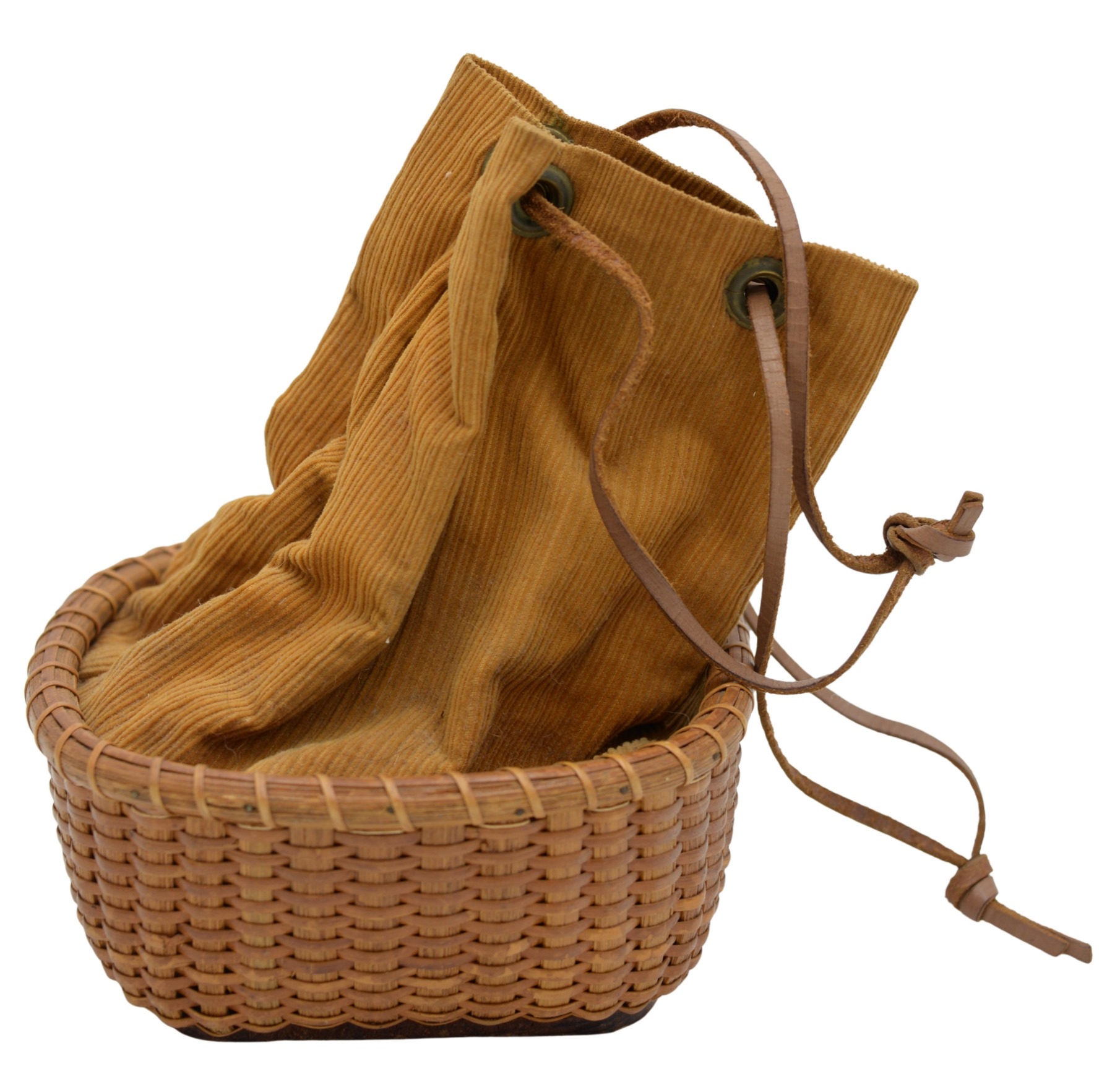 Jose Reyes Nantucket Basket/Purse, square with brown corduroy liner and leather drawstring, signed and marked on bottom “Made in Nantucket, Jose Formoso Reyes”, height 8 1/2 inches, diameter 7 inches.