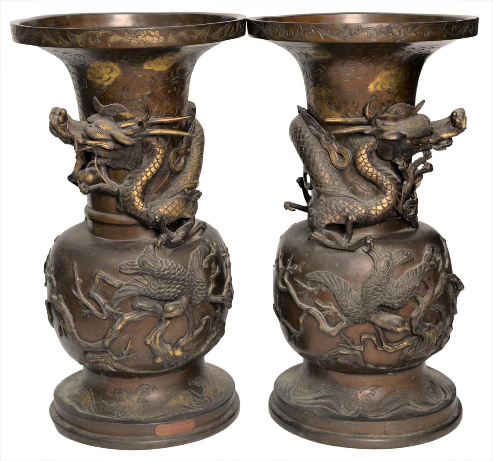 A Pair of Large Japanese Bronze Vases, having elephant head handles, molded phoenix bird and dragons, height 19 inches.