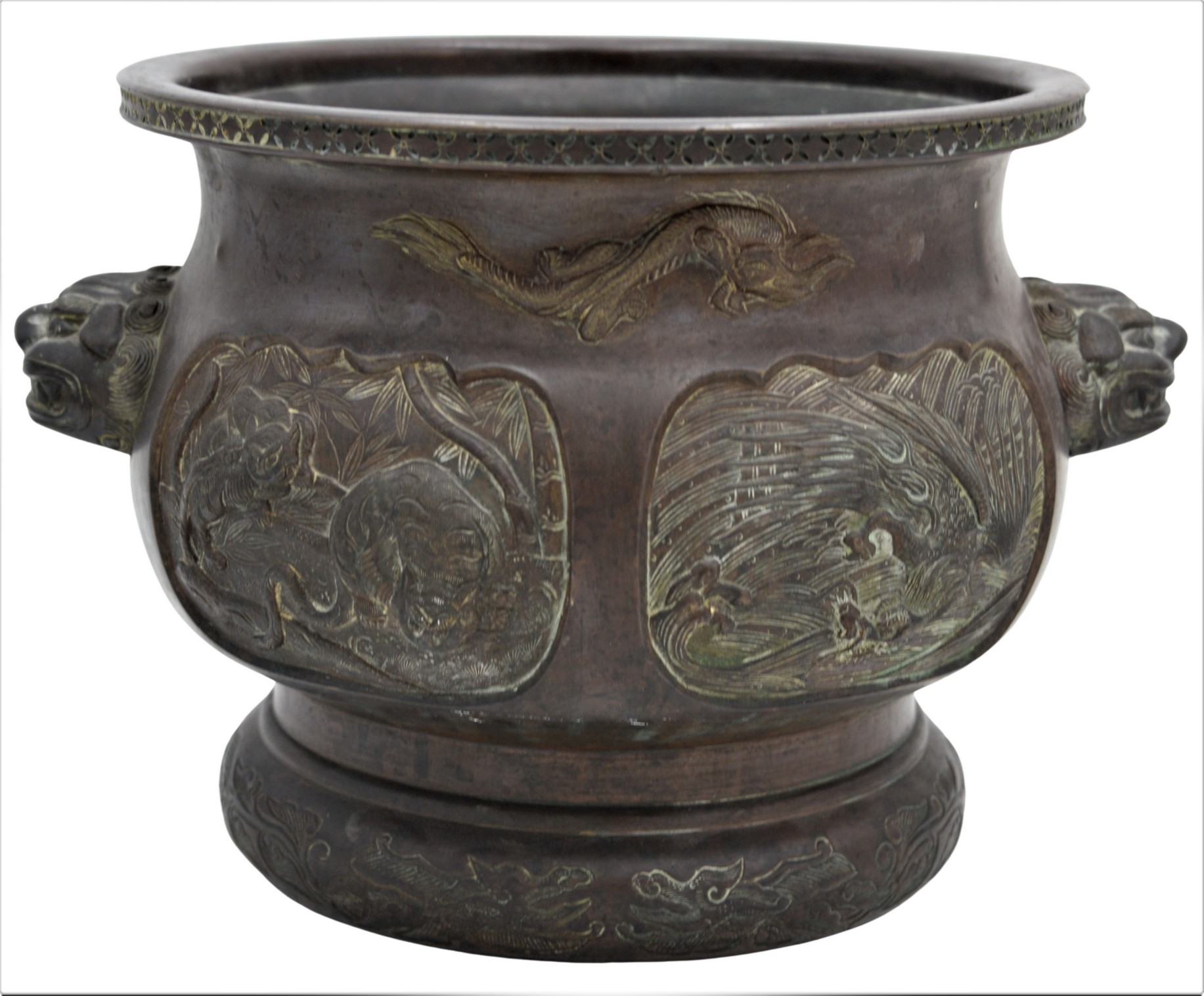 Large Chinese Bronze Incense Pot, depicting four panels of various animals and foo dog head handles, signed on bottom, height 9 3/4 inches, diameter 11 1/2 inches.