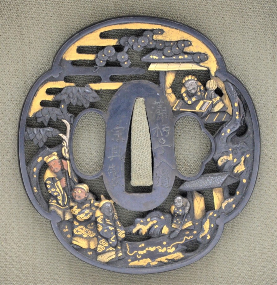 Japanese Tsuba Multi-Metal Bronze, to include gold, silver and copper reticulated and signed, in fitted box, height 3 inches, length 2 3/4 inches.