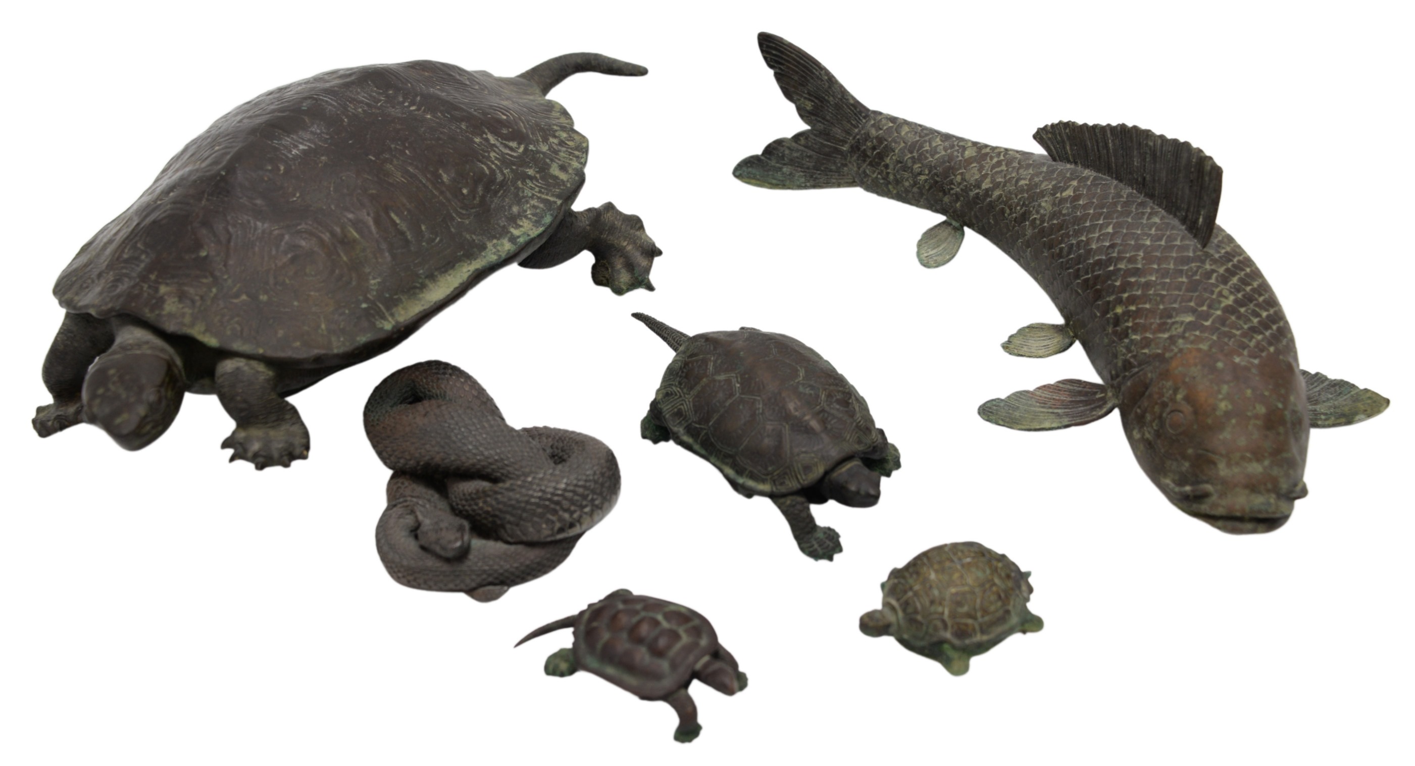 Group of Six Japanese Bronze Okimono, Meiji and Taisho Period, 19/20th Century, comprised of well-cast and articulated turtle, signed by sculptor/maker, length 12 inches, along with three smaller turtles, one a lidded box, a carp 12 inches and coiled copper snake 5 inches.