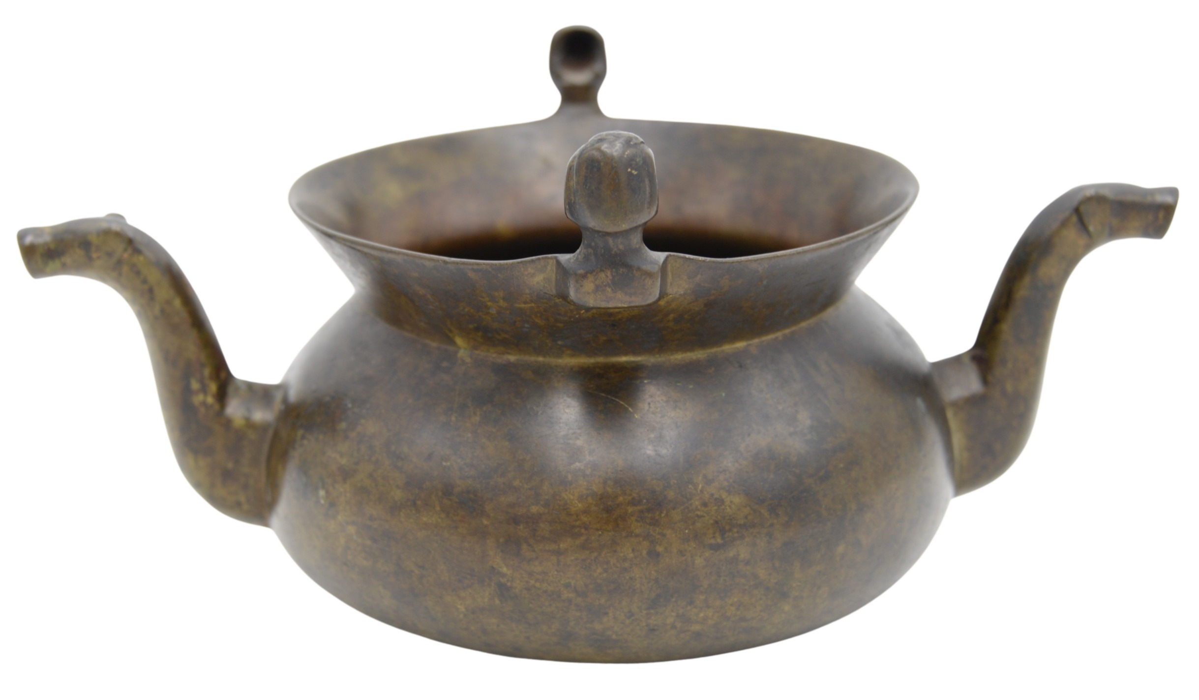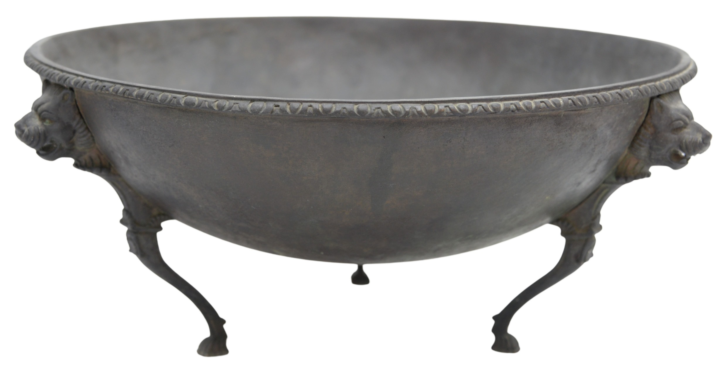 Early Bronze Ceremonial Feast Bowl, sitting on three legs, each topped with lion and masks, possibly 18th century or earlier, height 6 3/4 inches, diameter 15 1/4 inches.