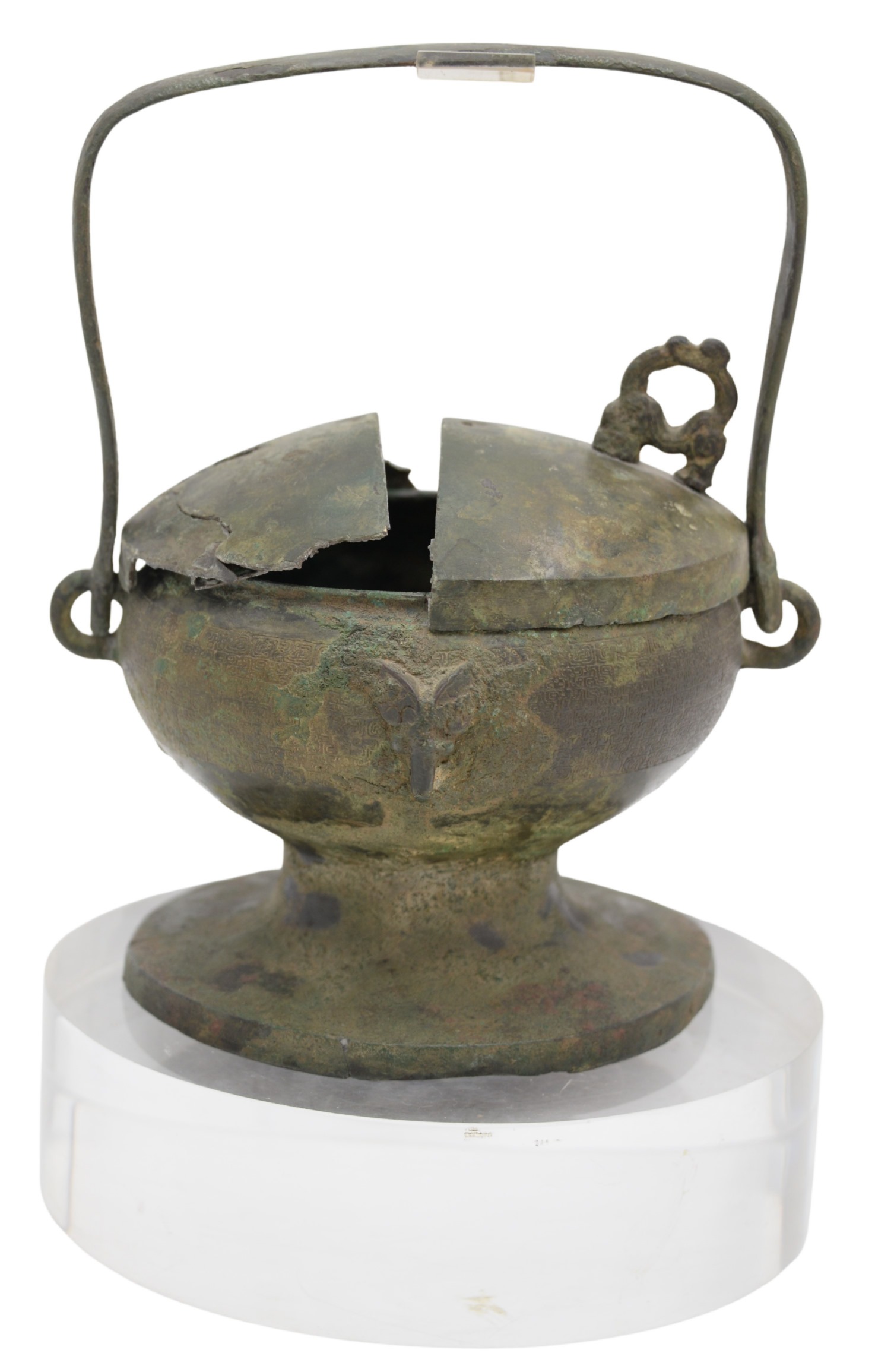Archaic Bronze Censer with Cover, having animal masks on vermiculated scroll ground body on raised footed base, dome cover with two loop handles (as is) beneath swing carrying handle, height 8 1/2 inches, diameter 6 1/2 inches.
