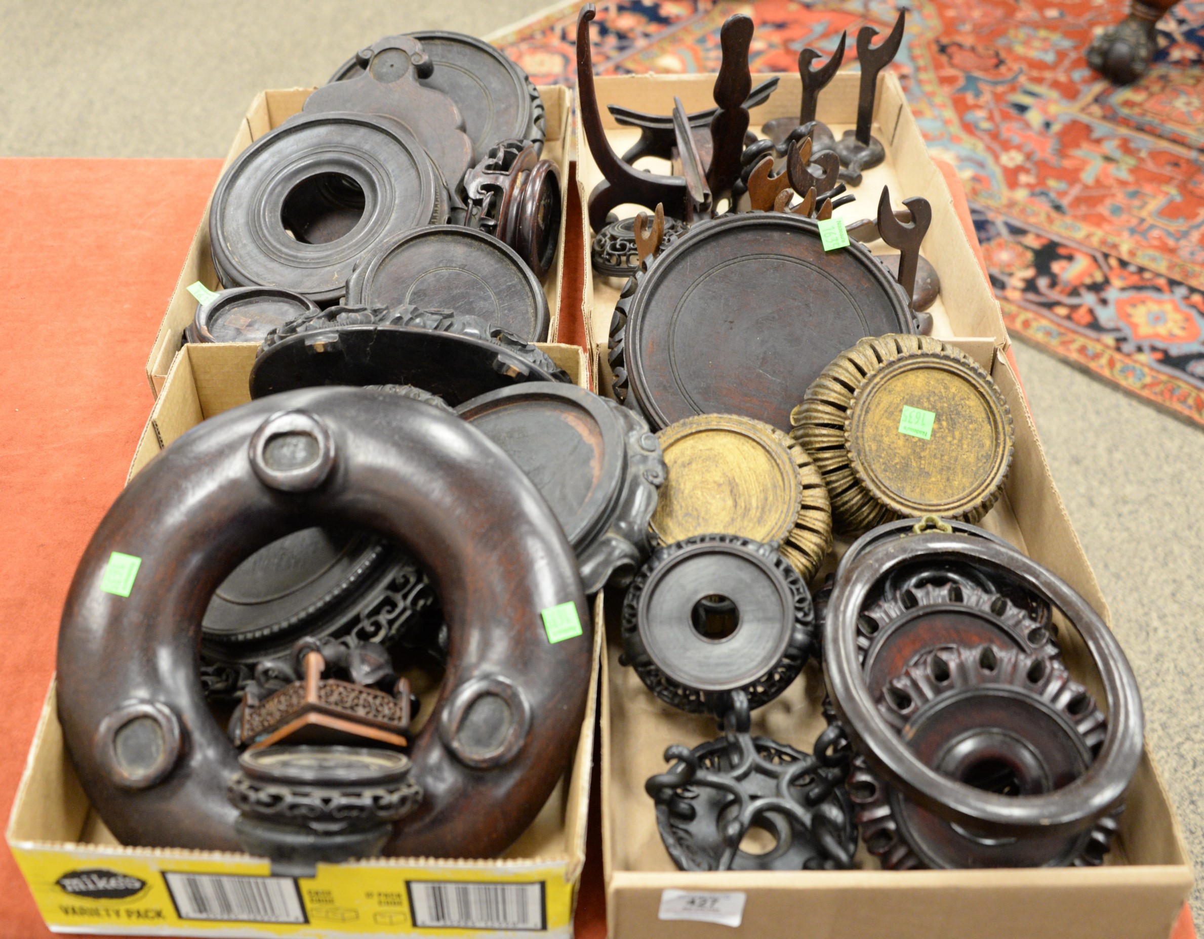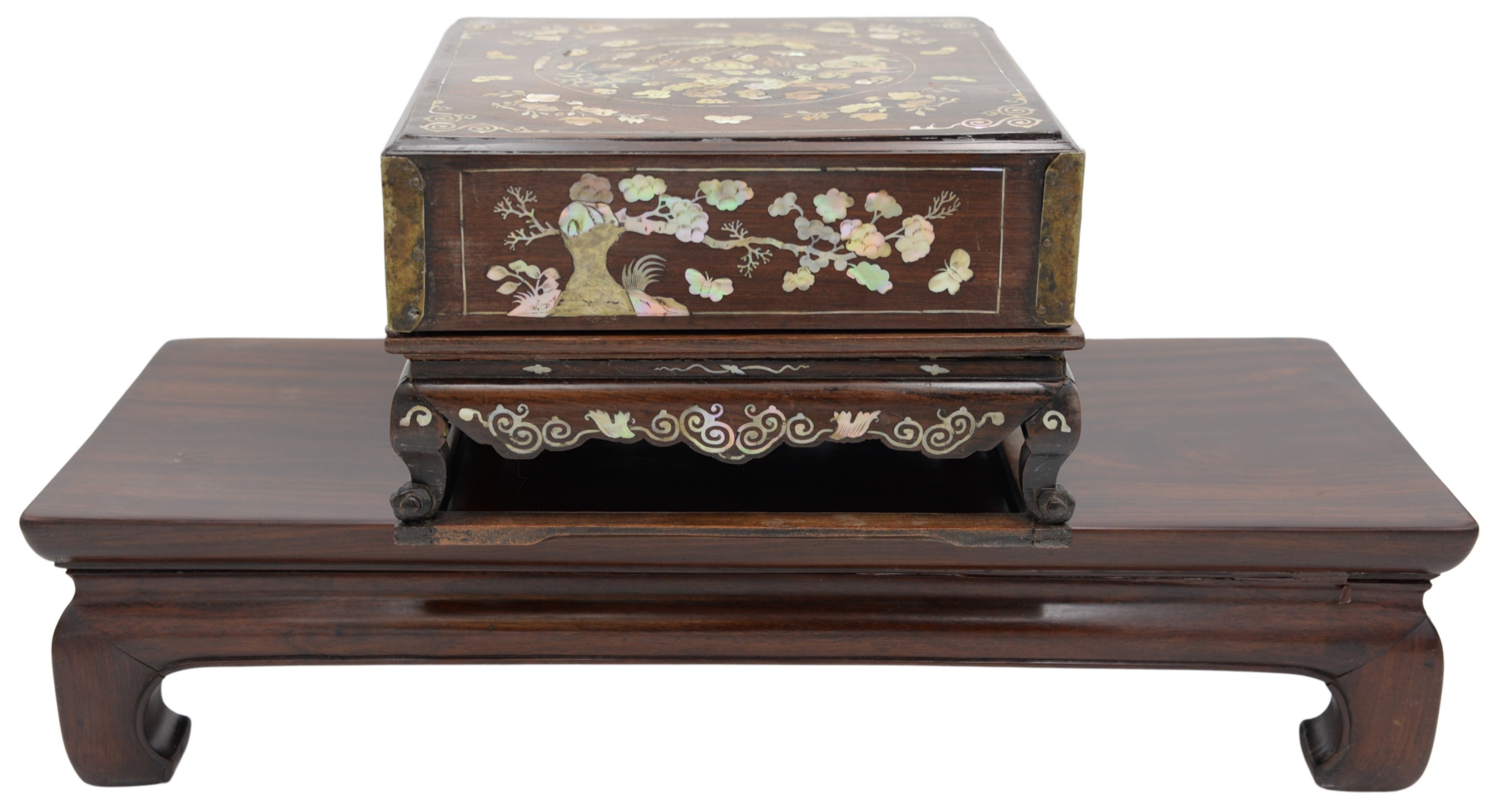Two Carved Wood Pieces, to include a hardwood box having inlaid mother of pearl birds, flowers, phoenix bird, and auspicious motifs on stand on cabriole legs, height 6 1/4 inches, length 9 3/4 inches, depth 9 3/4 inches; along with a large hardwood rectangular stand, height 5 inches, length 22 inches, depth 9 1/2 inches.