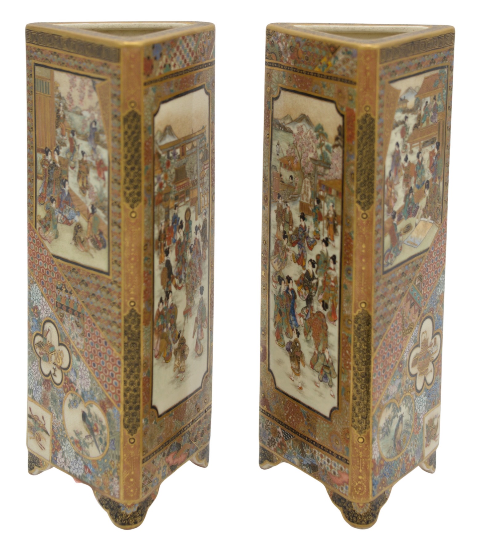 Pair of Japanese Satsuma Vases, Meiji or Taisho Period, 19/20th Century, of triangular shape and raised on three scalloped feet., decorated with central cartouche of bijin in courtyard with torii and mountains in the background, four- character signature in scripted gilt on black lozenge, possibly Kisan zo no (“Kisan created this”) and can refer to multiple artists of this maker, height 91/4 inches.