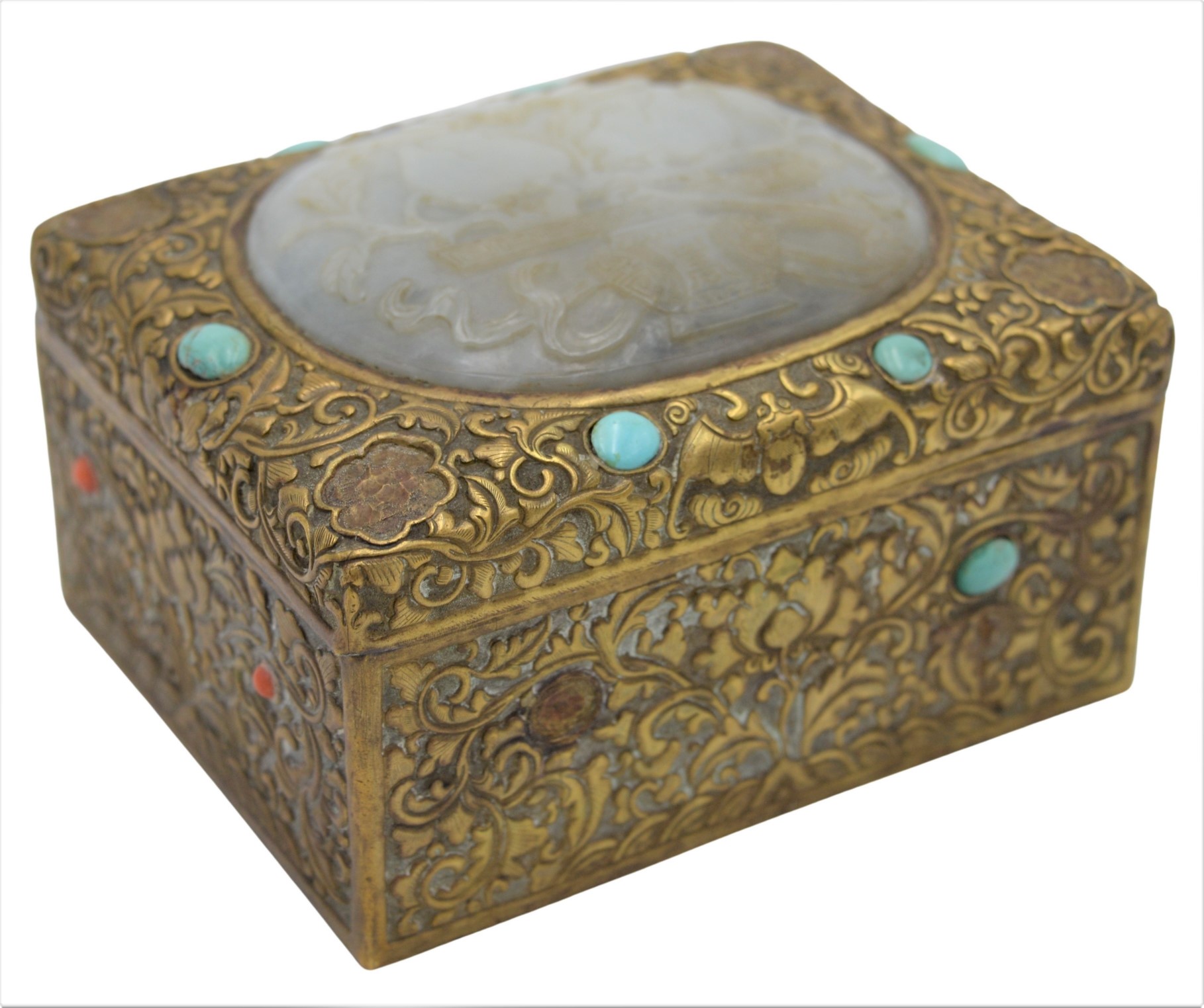 Chinese Brass Box, mounted with center carved white jade, along with turquoise and various stones, some missing, late 19th century box,