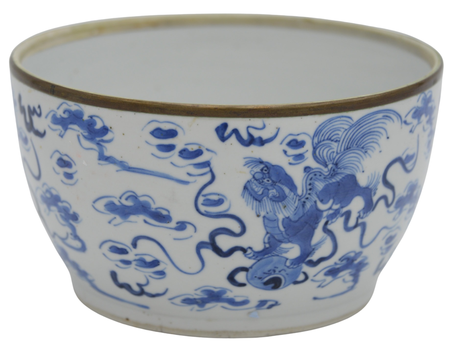 Chinese Blue and White Porcelain Bowl, having brass rim along with foo dogs surrounded by clouds and ribbons, 19th century or earlier, height 6 1/2 inches, diameter 3 3/4 inches.