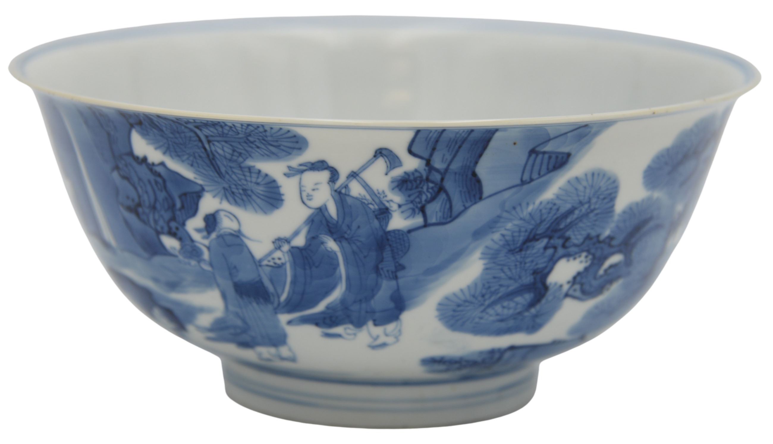 Chinese Blue and White Bowl, 19th century, body decorated with figures in a landscape, base with an apocryphal Ming Chenghua six-character regnal mark, diameter 8 1/4 inches.