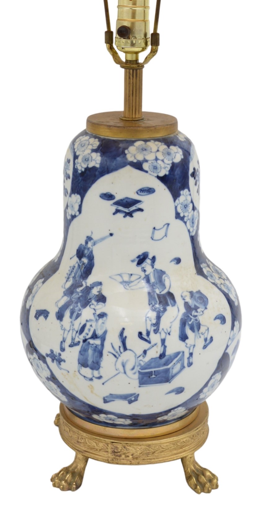 Chinese Blue and White Gourd Vase (Huluping), 19th century, decorated with central figural and secondary floral cartouches on a prunus flower background and mounted as a lamp with gilt ormolu base, vase height 12 inches, total height 29 inches.