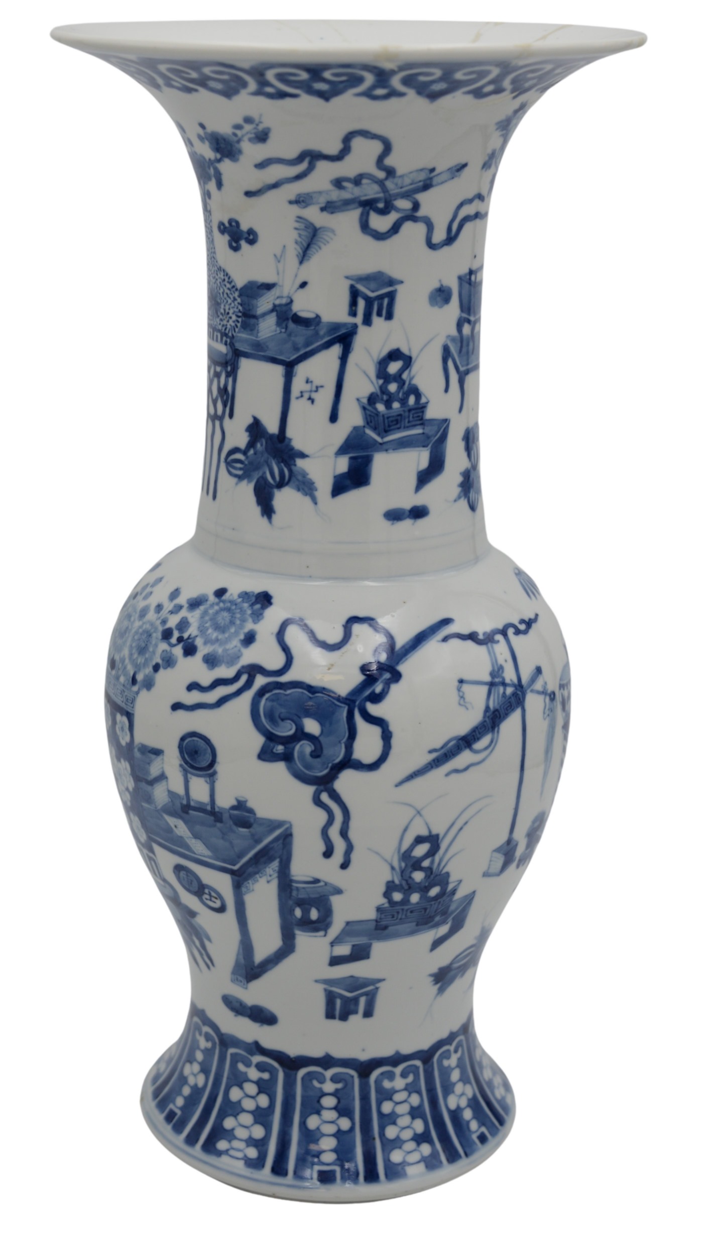 Chinese Blue and White Porcelain Vase, having flared neck with Kangxi style border, painted with precious objects and scholar’s articles and flowers above a bulbous body, six character mark within double circle, (rim repaired), height 17 3/4 inches.