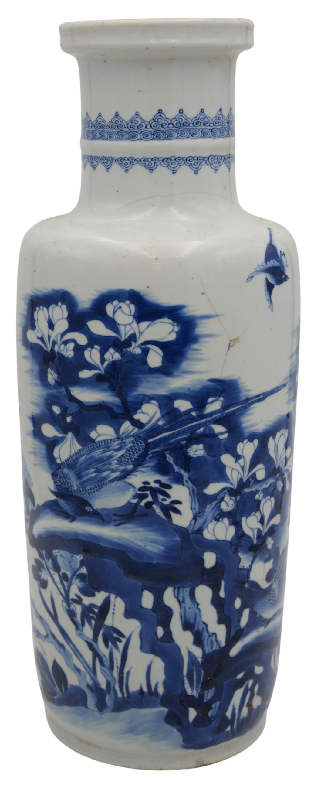 Chinese Blue and White Rouleau Vase, 19th century, the body decorated with floral branches and flying birds, the neck rimmed with multiple jui-head borders, having no mark, there is a small 4 inch hairline visible inside the neck, height 19 inches.