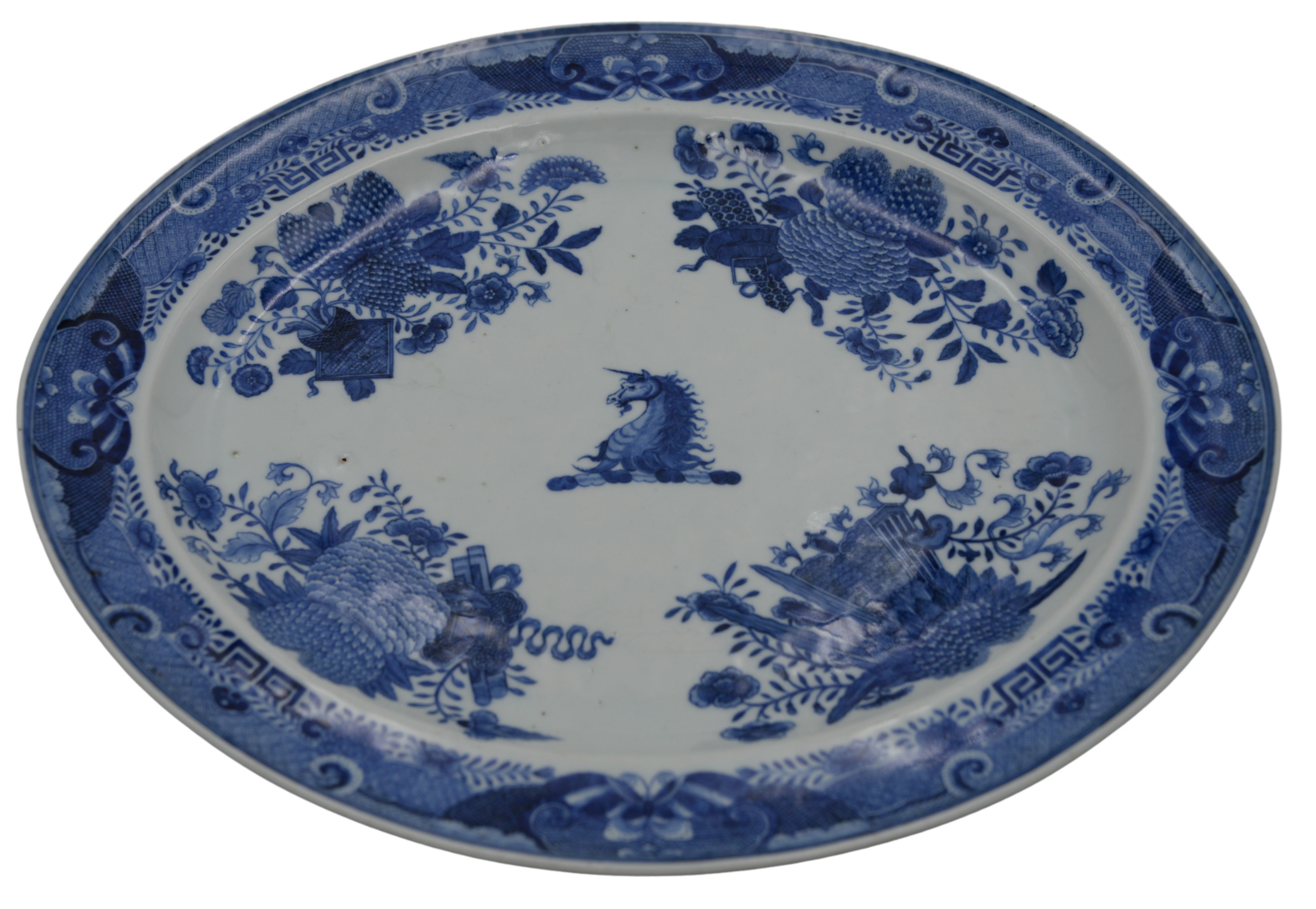 Large Chinese Export Porcelain Blue and White Oval Platter, painted in the center with unicorn’s armorial crest of Beale within a “Fitzhugh” pattern of four clusters of flowers and precious objects, the rim having a border of patterned panels, length 17 3/8 inches.