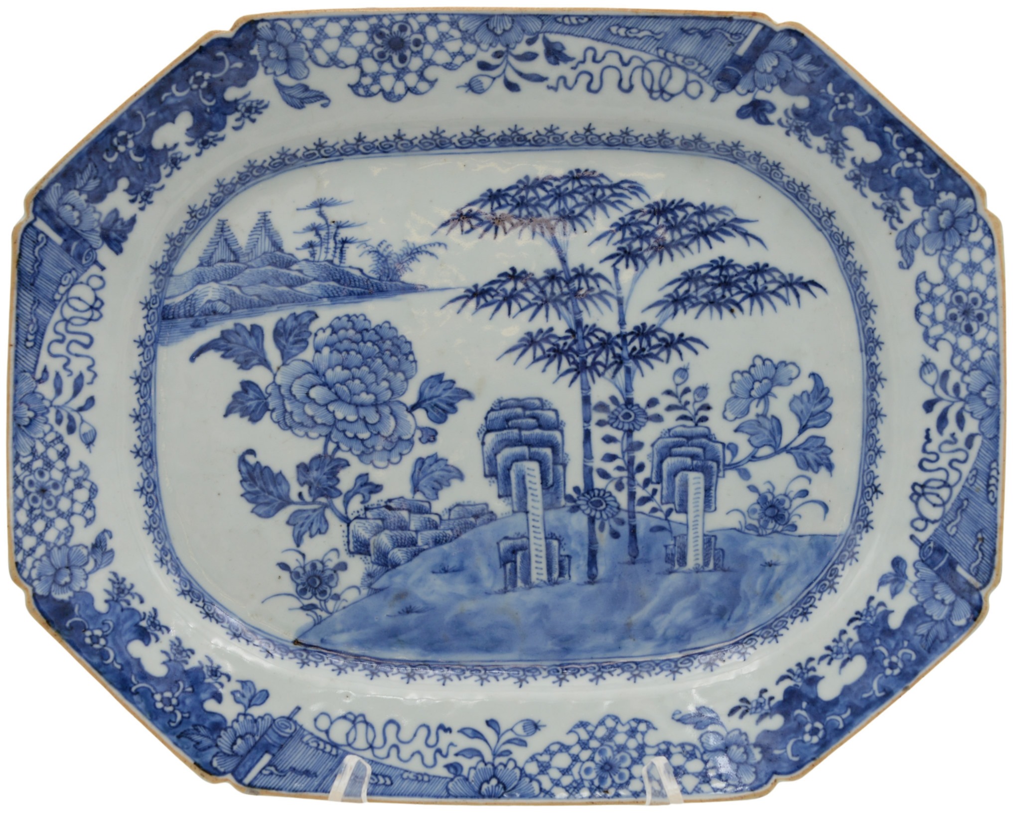 Chinese Export Porcelain Blue and White Rectangular Platter, painted in underglaze-blue in the center with a flowering peony and bamboo before a distant island, having stylized ruyi-head band, along with rim having border of scrolls, flowers and patterned pomegranate motifs, 18th century or later, minor flakes on rim, width 14 3/4 inches.