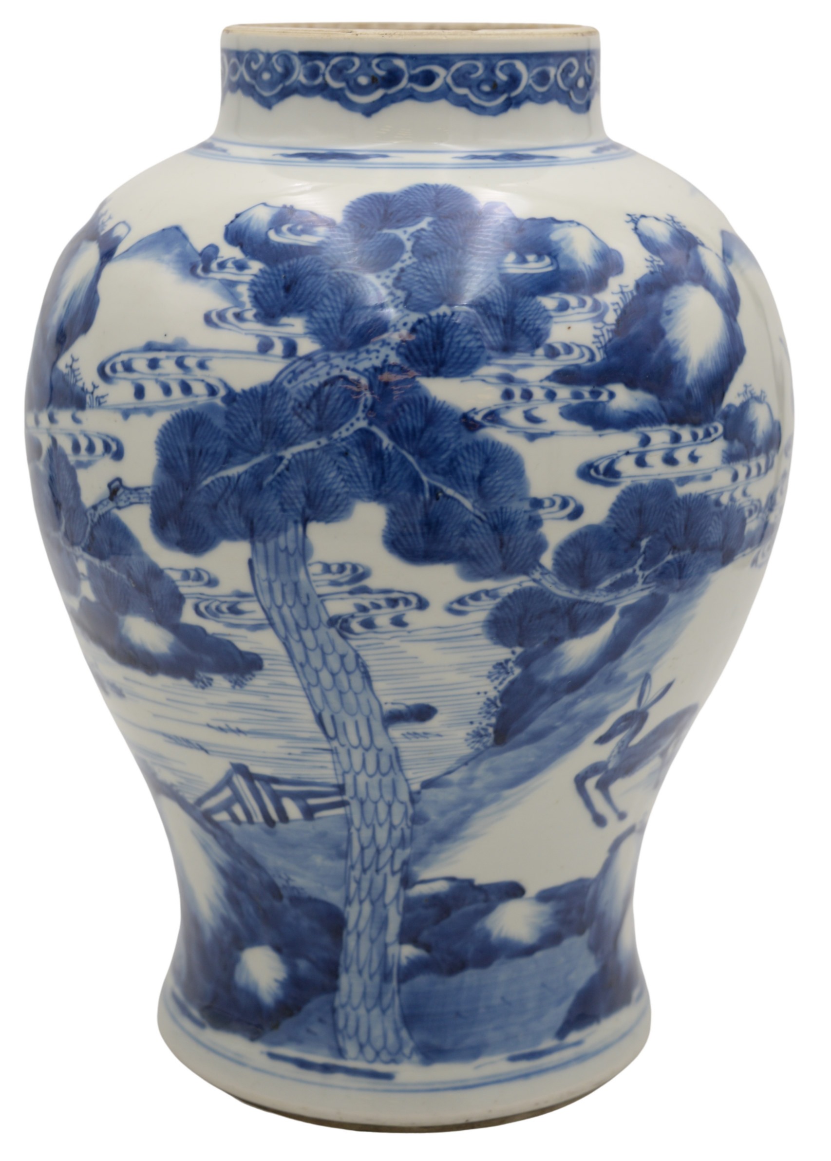 Chinese Blue and White Porcelain Baluster Jar, painted with a landscape scene depicting deer and cranes, nechaving ruyi borders, height 13 1/2 inches.