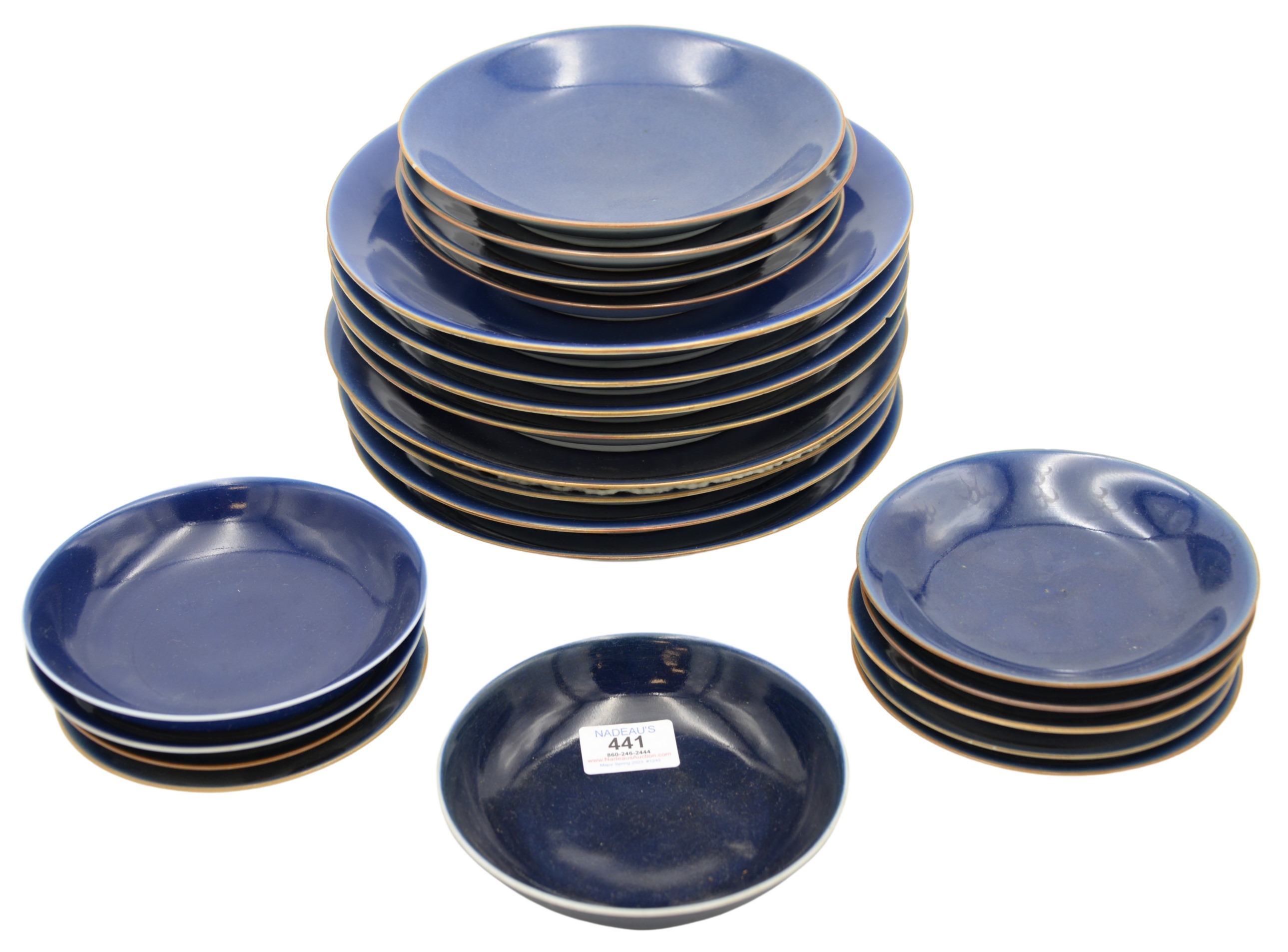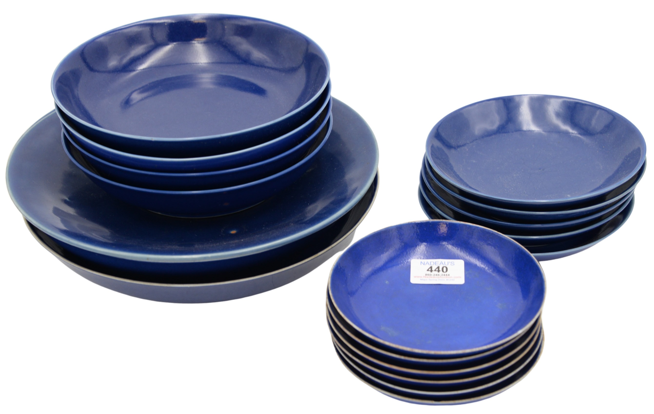 Group of 45 Chinese Porcelain Underglaze Blue Dinnerware Set, each deep blue glazed, having white rim and marked with seal mark on bottom, to include 11 dinner plates, diameter 9 1/2 inches; 15 shallow bowls, diameter 7 1/4 inches; 9 luncheon plates, diameter 8 1/2 inches; along with 10 deep bowls, diameter 7 inches.