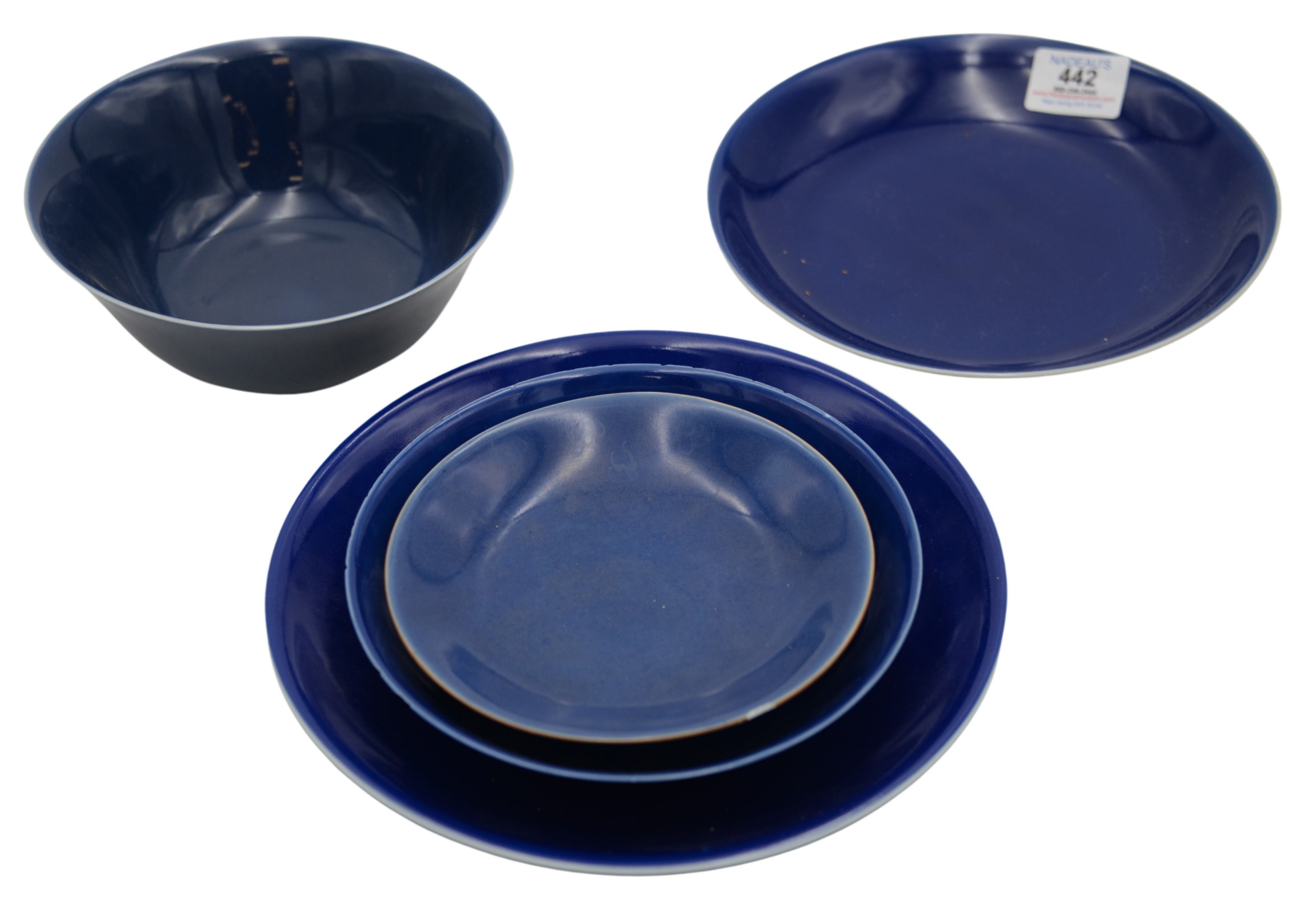 Group of 18 Chinese Monochrome Cobalt Blue Plates, 19th/20th century, comprised of large pair of charges, diameter 10 inches, with Gaangxu marks; two pair of 8 inch saucer plates having Guangxu and Xuantong marks; 11 small saucers, unmarked, diameter 6 inches; along with an unmarked charger, diameter 11 inches.