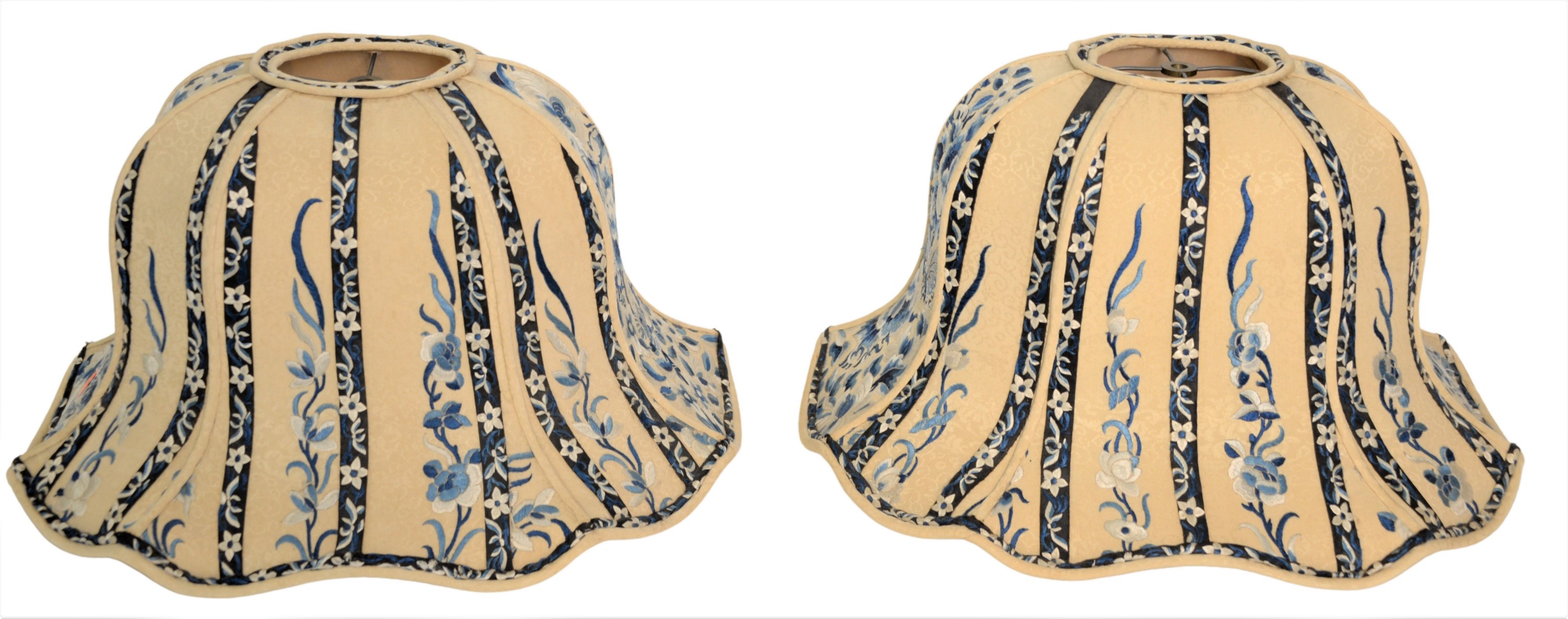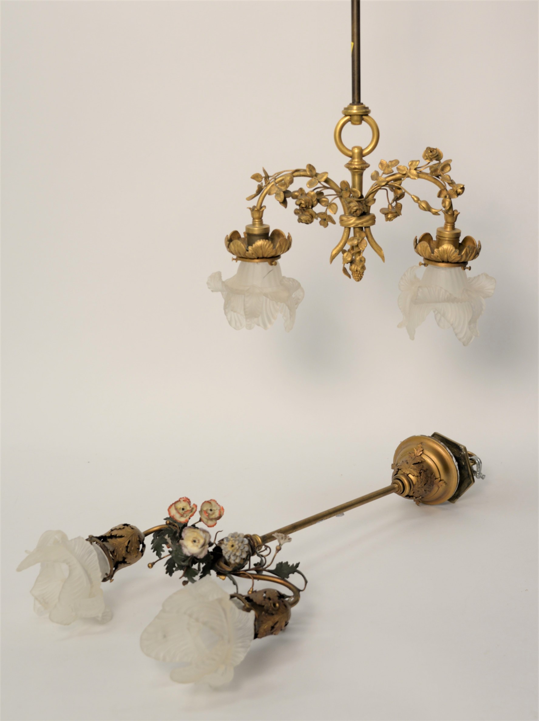 Two Victorian Hanging Lights, two light gilt bronze with frosted flower shades, along with painted metal two light with frosted flower shades, height with shades 31 inches.