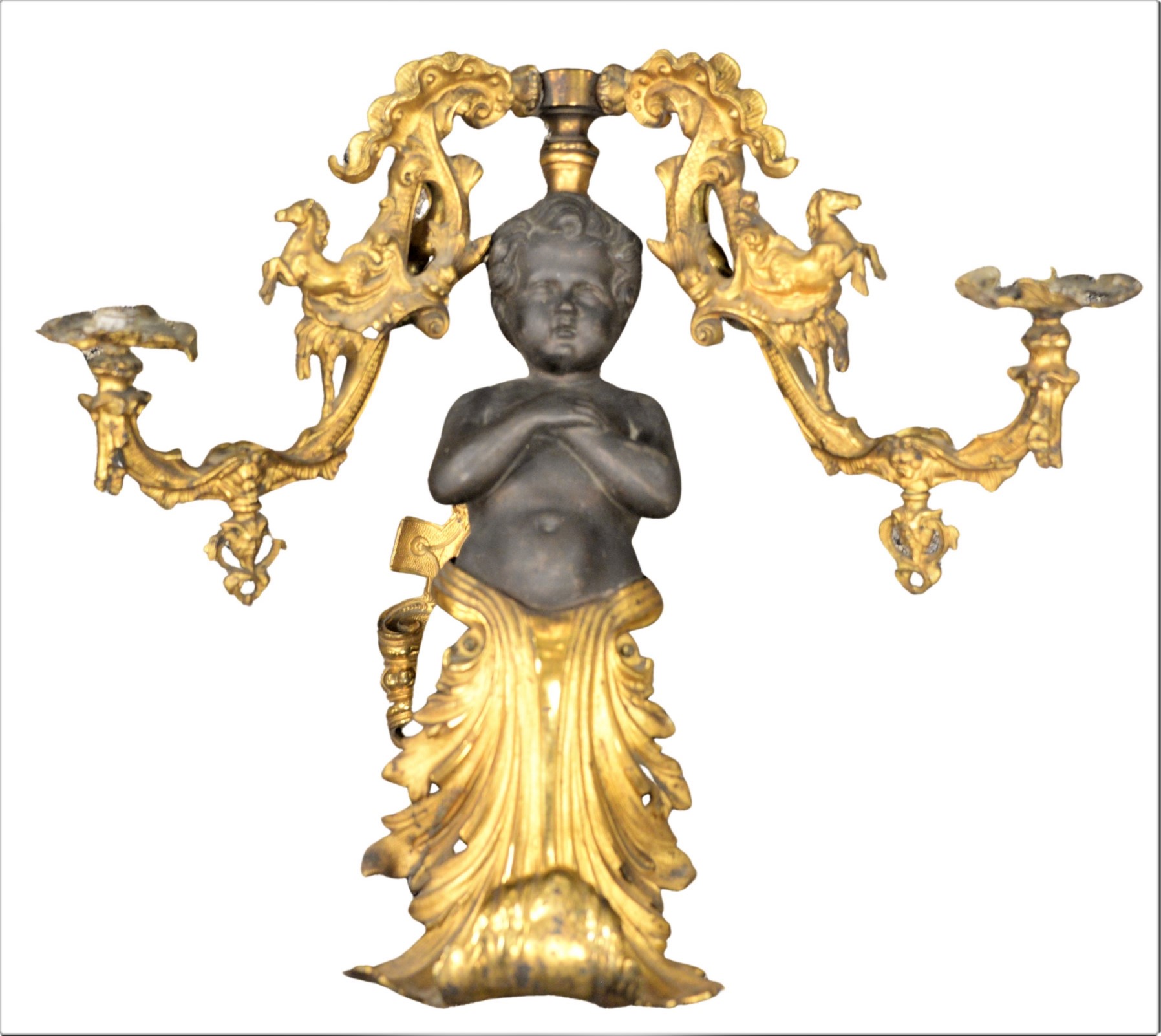 Bronze Figural Sconce, having putti body with fish scale tail attached to gilt wall mount and having gilt gas arms, along with horses, gilt and scrolled skirt, (top missing), height 17 inches.