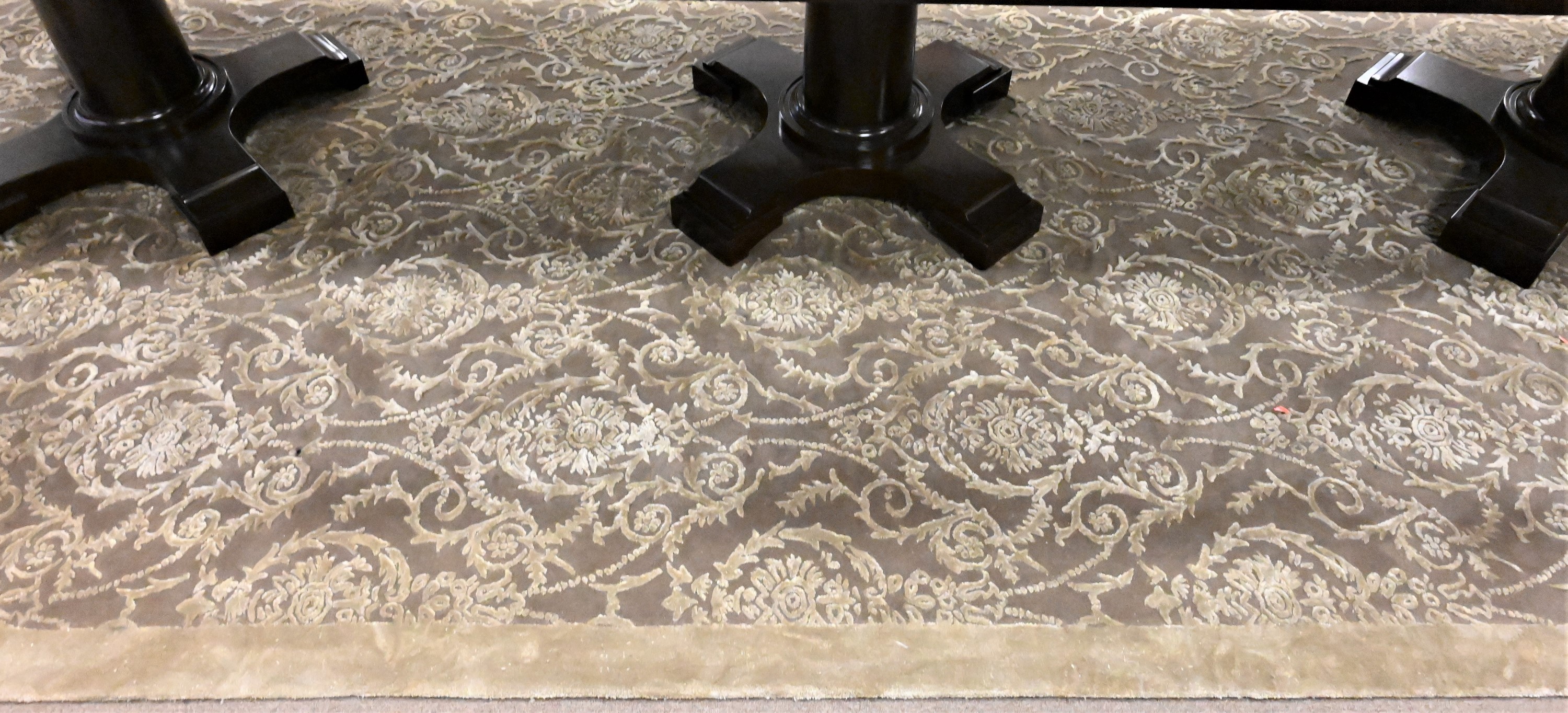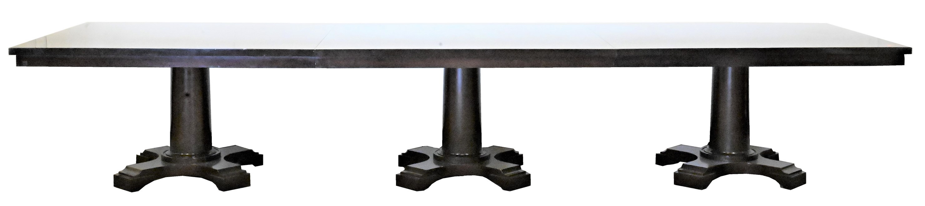 Large Triple Pedestal Dining Table, hardwood with espresso stain, having three sections each 50″x5′, on circular pedestal bases, width 50″ total length 15′, each section 5′ in length
