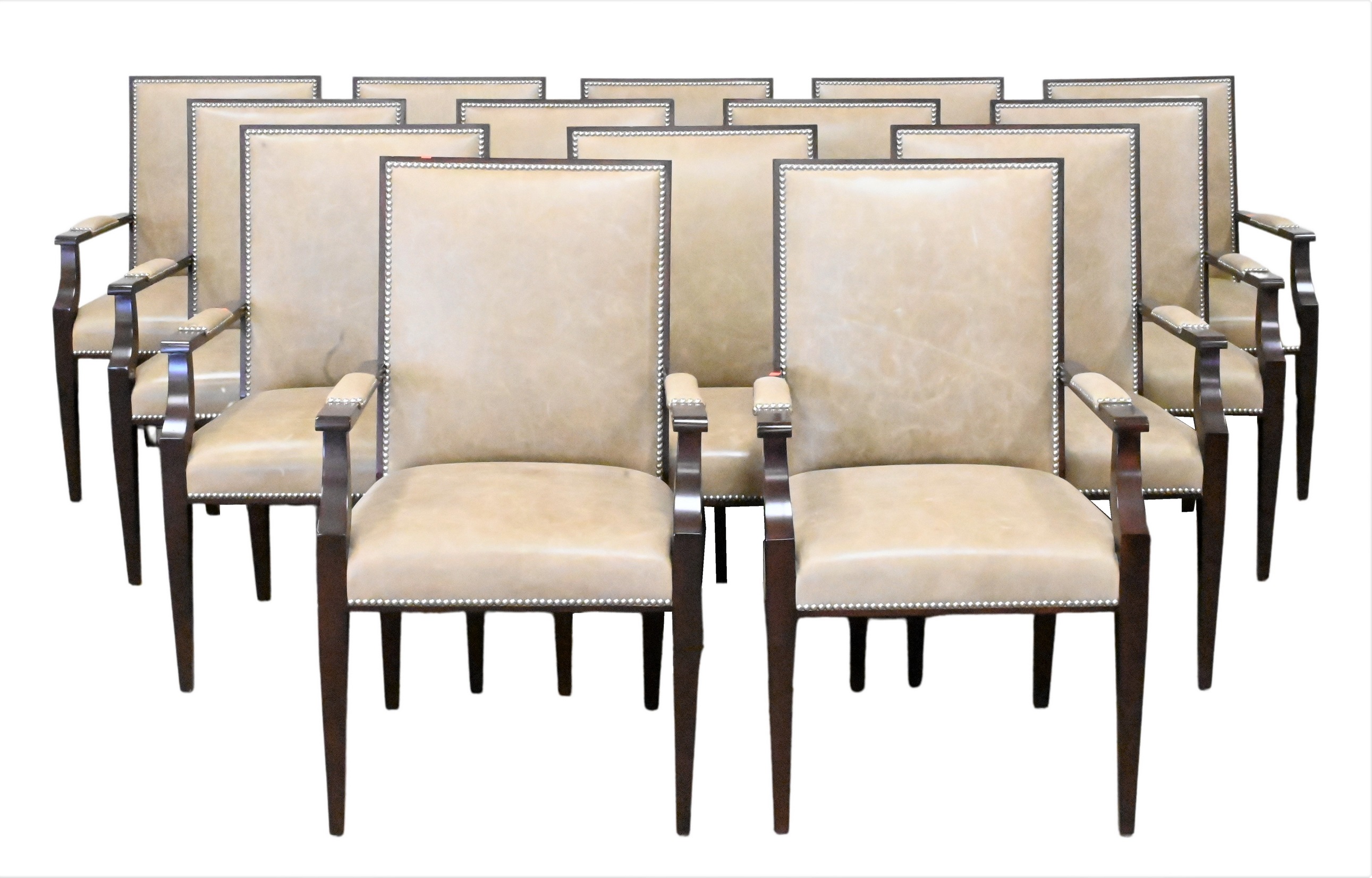 Set of 14 Modern Arm Chairs, Ralph Lauren style, having tan leather with pewter tacks on hardwood espresso frame, height 39 inches, seat height 18 inches, width 23 inches.