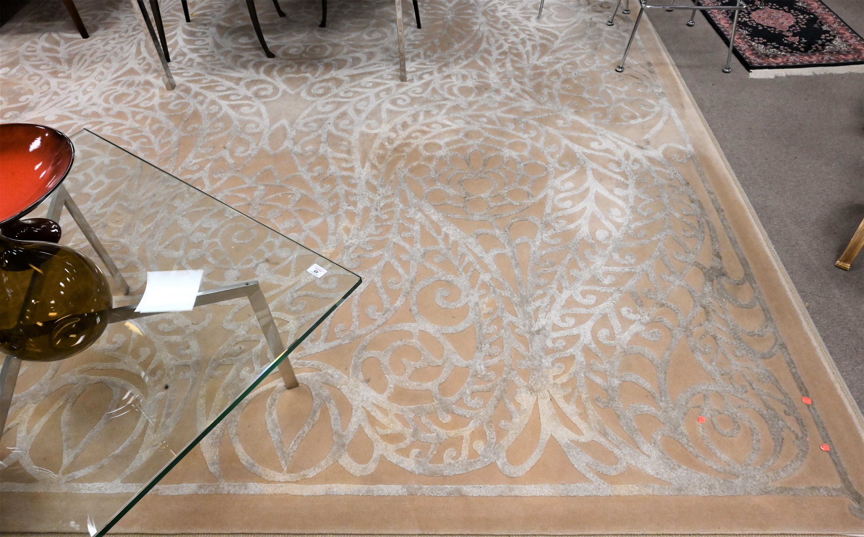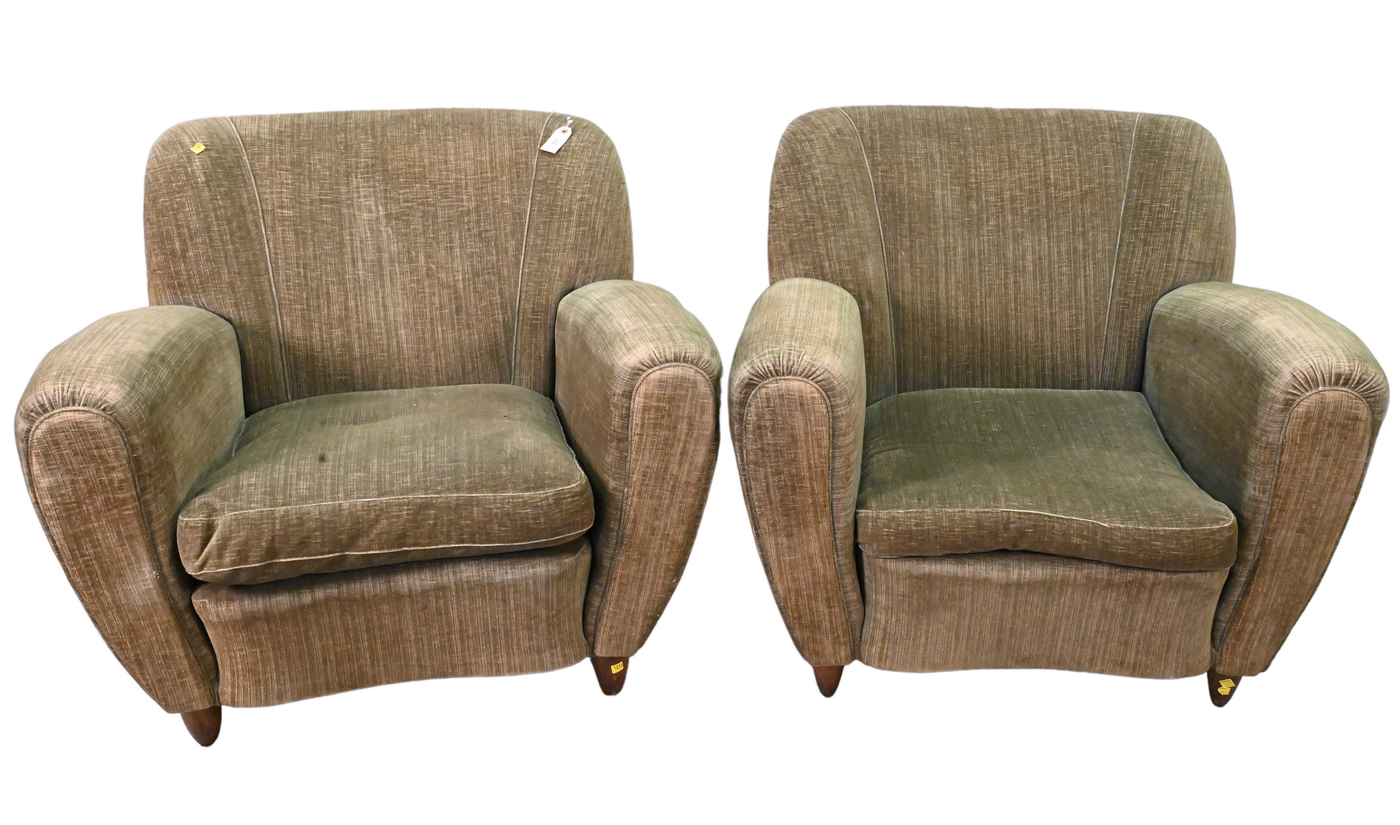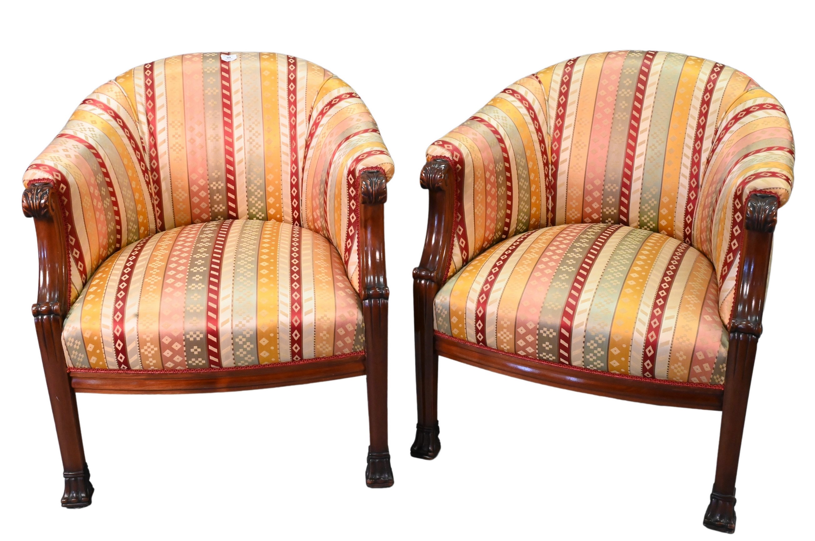 A Pair of Club Chairs, having carved mahogany frames and custom silk upholstery, height 32 1/2 inches, width 29 inches. Provenance: Property from a private New York collection sold to benefit charitable foundations.