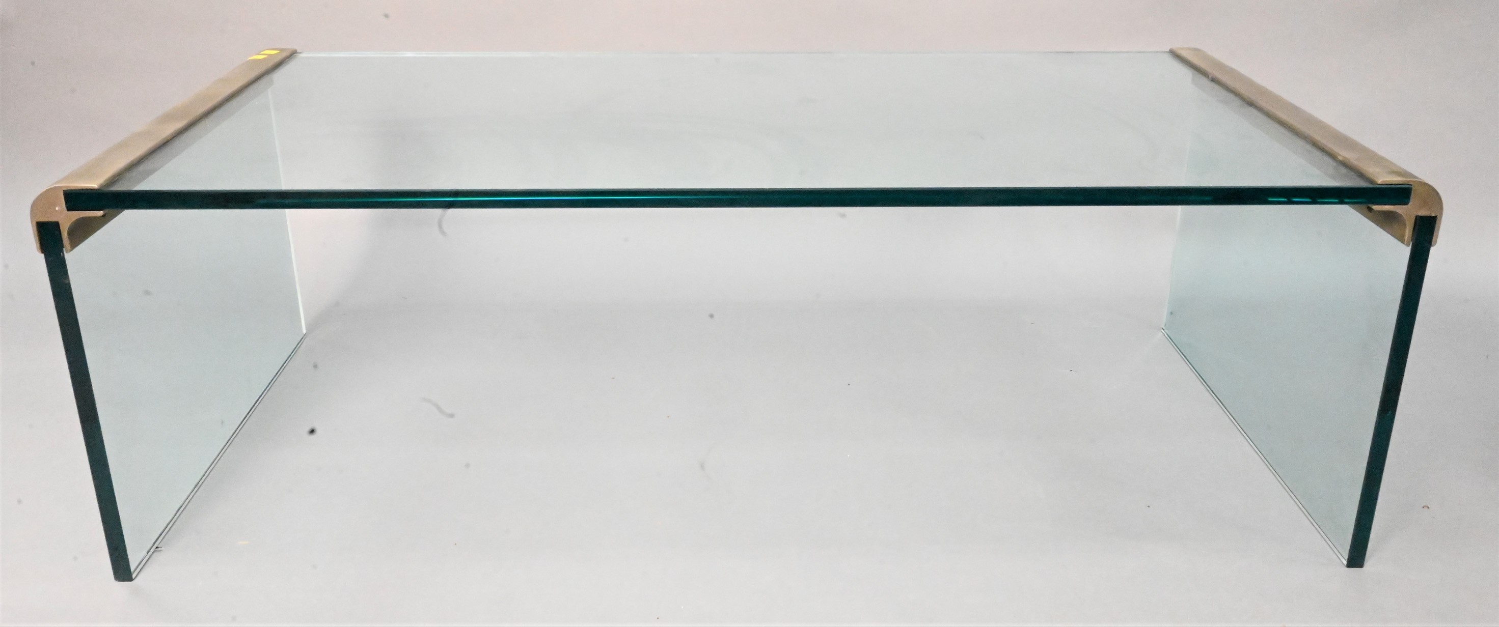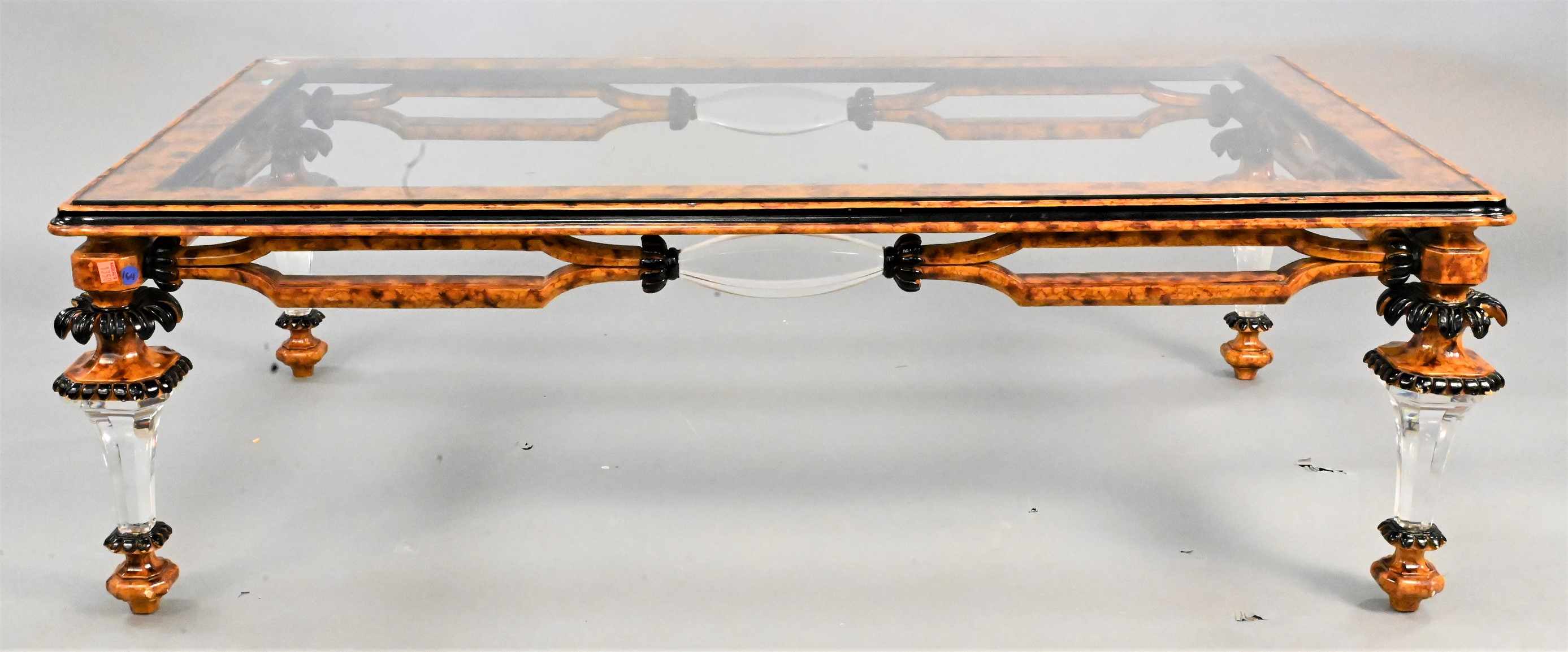 Baroque Style Faux Tortoiseshell Parcel-Ebonized and Glass Coffee Table, rectangular top with a glass panel and top above a pierced frieze with glass segments, raised on parcel-ebonized faux tortoise shell and glass molded legs, height 17 1/2 inches, top 31 1/2″ x 54 1/2″. Provenance: Property from a private New York collection sold to benefit charitable foundations.