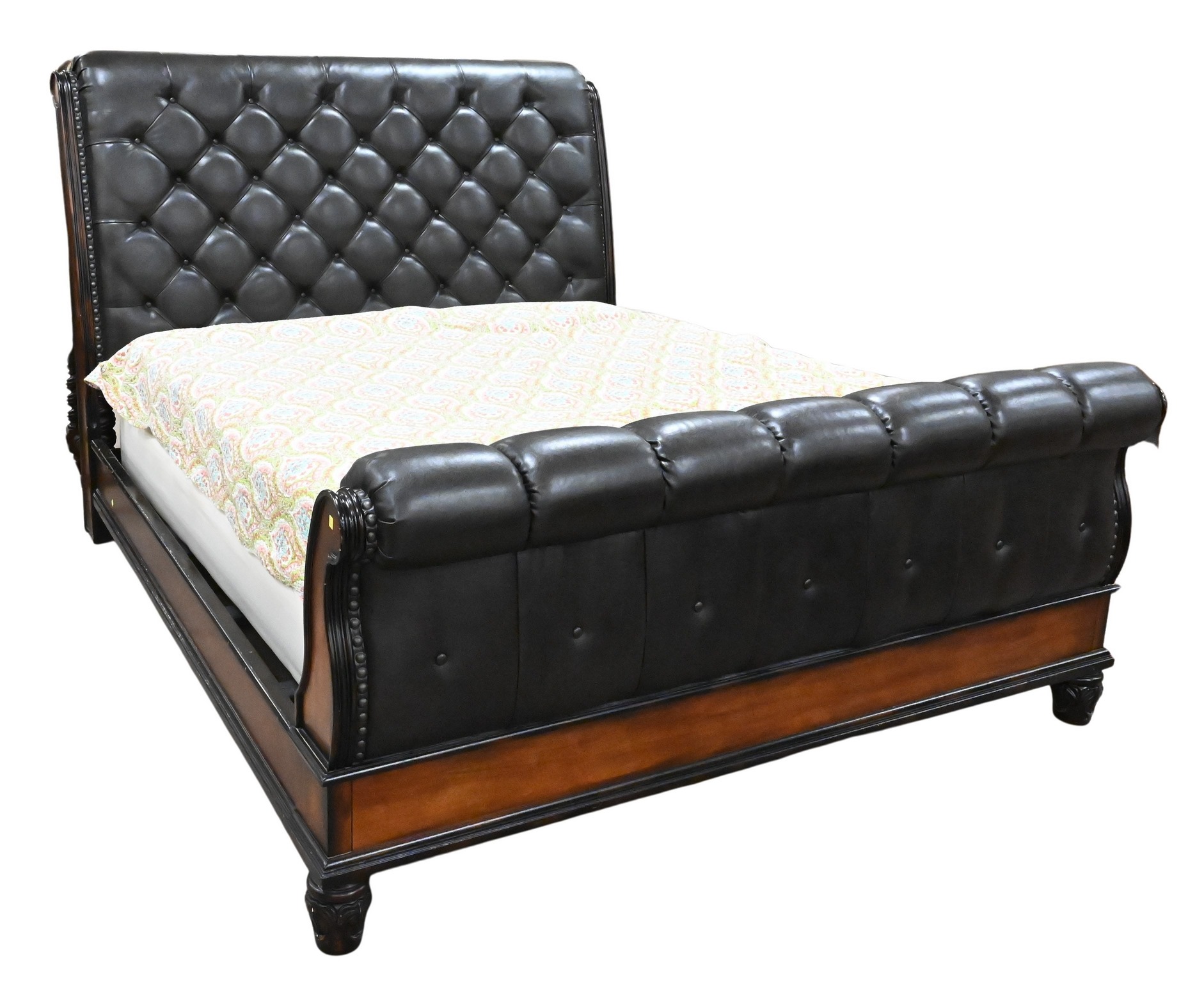 Three Piece Bedroom Set, to include a leather upholstered tufted king size sleigh bed, a night stand/chest, along with a triple chest, height 63 inches.