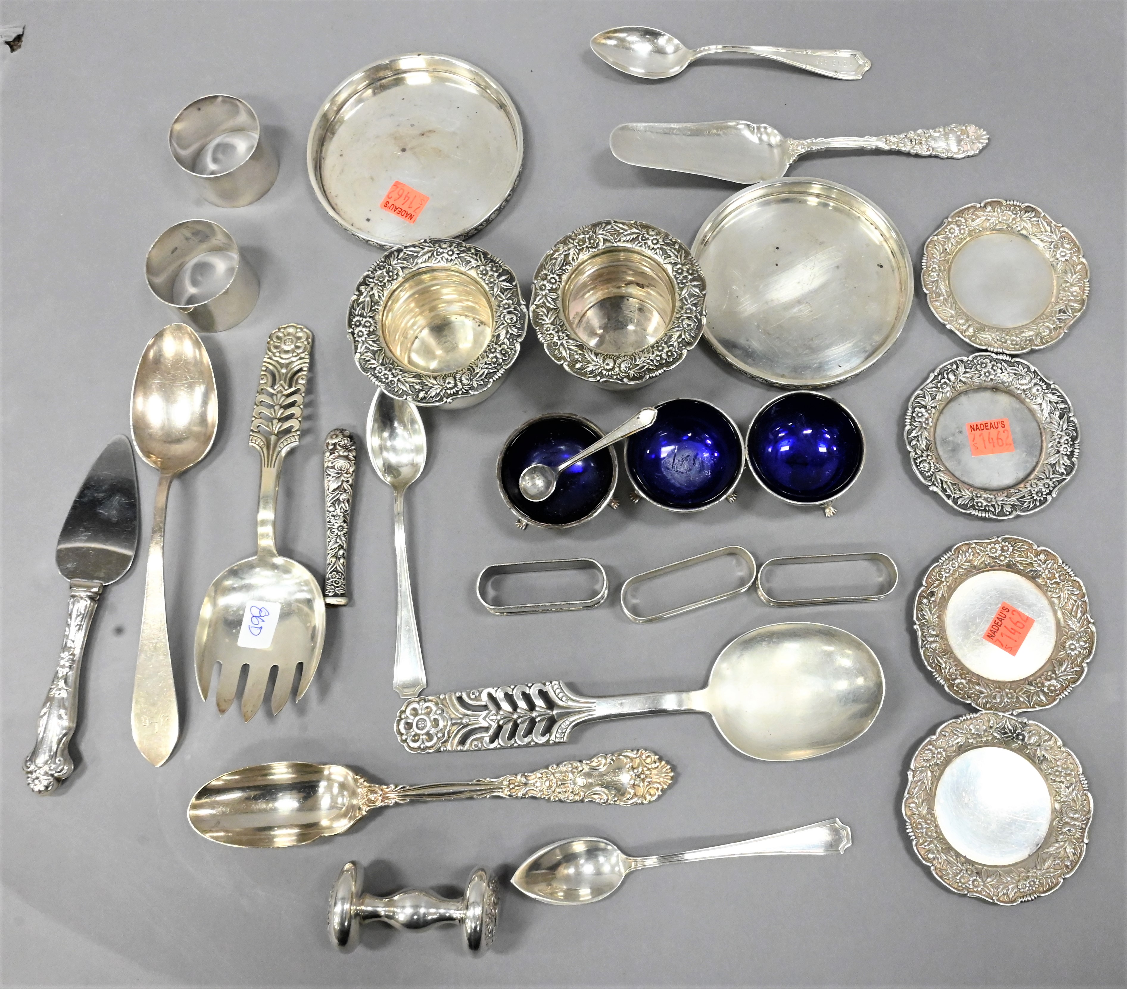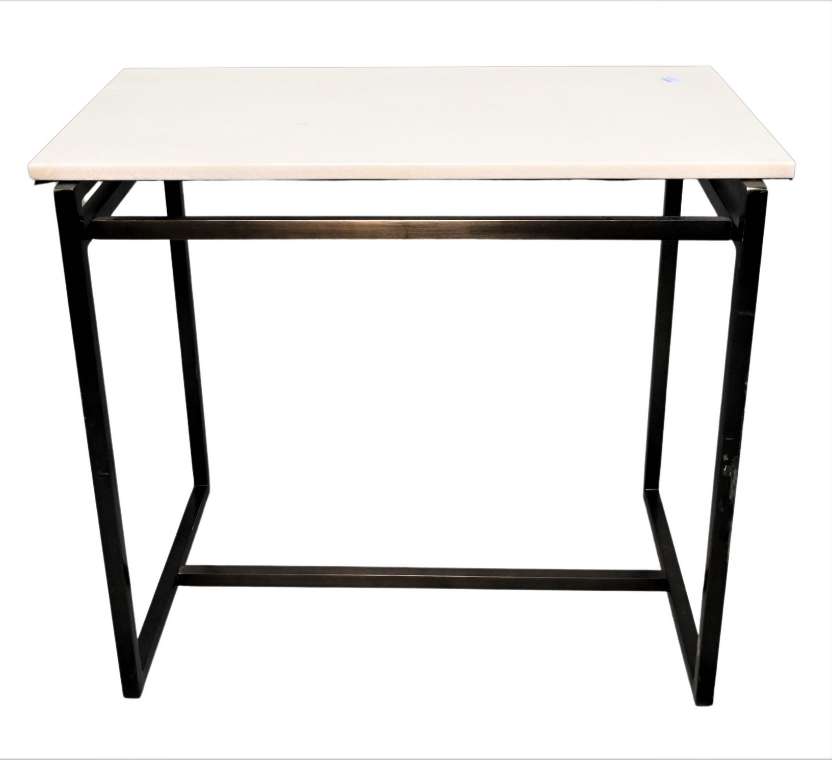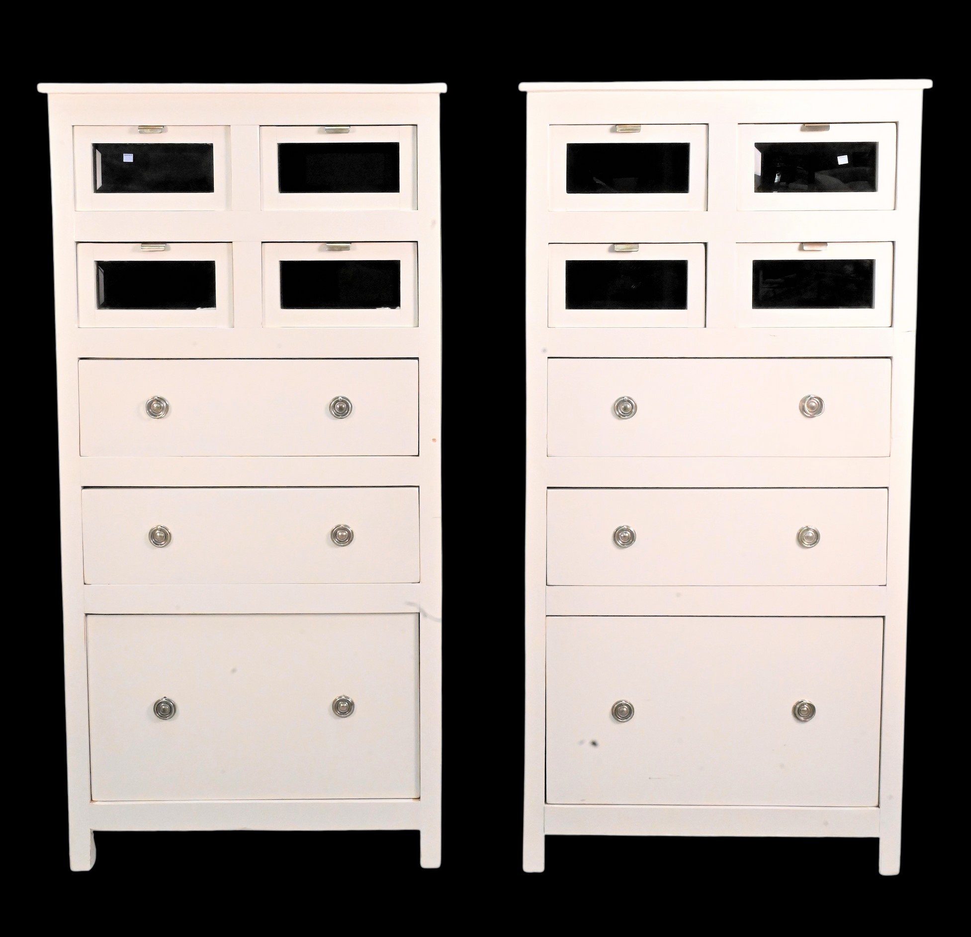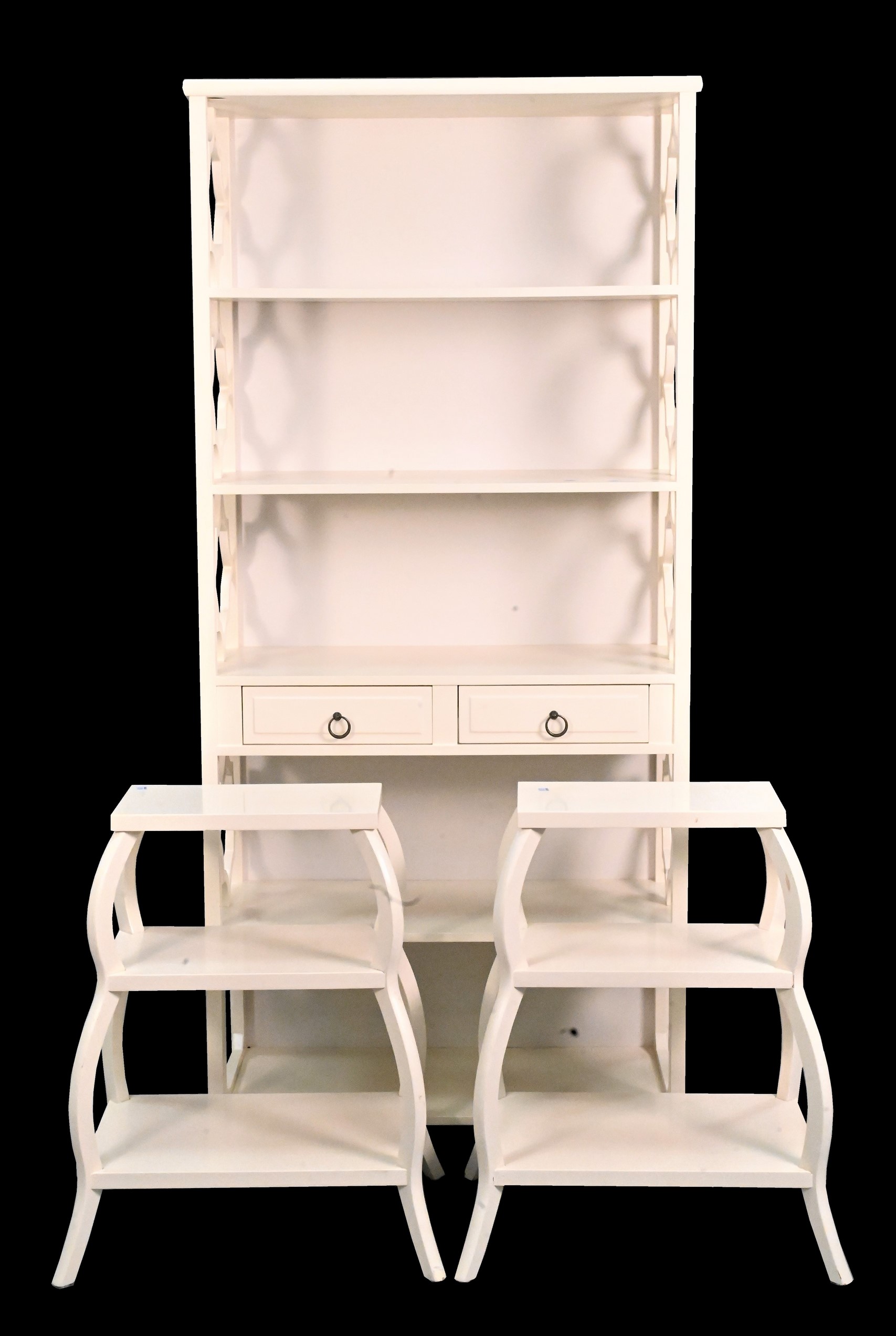 Three Piece Enamel White Lot, to include an etagere/bookcase, along with two three-tier stands, height of stands 27 1/2 inches, bookcase height 71 inches, width 31 1/2 inches.