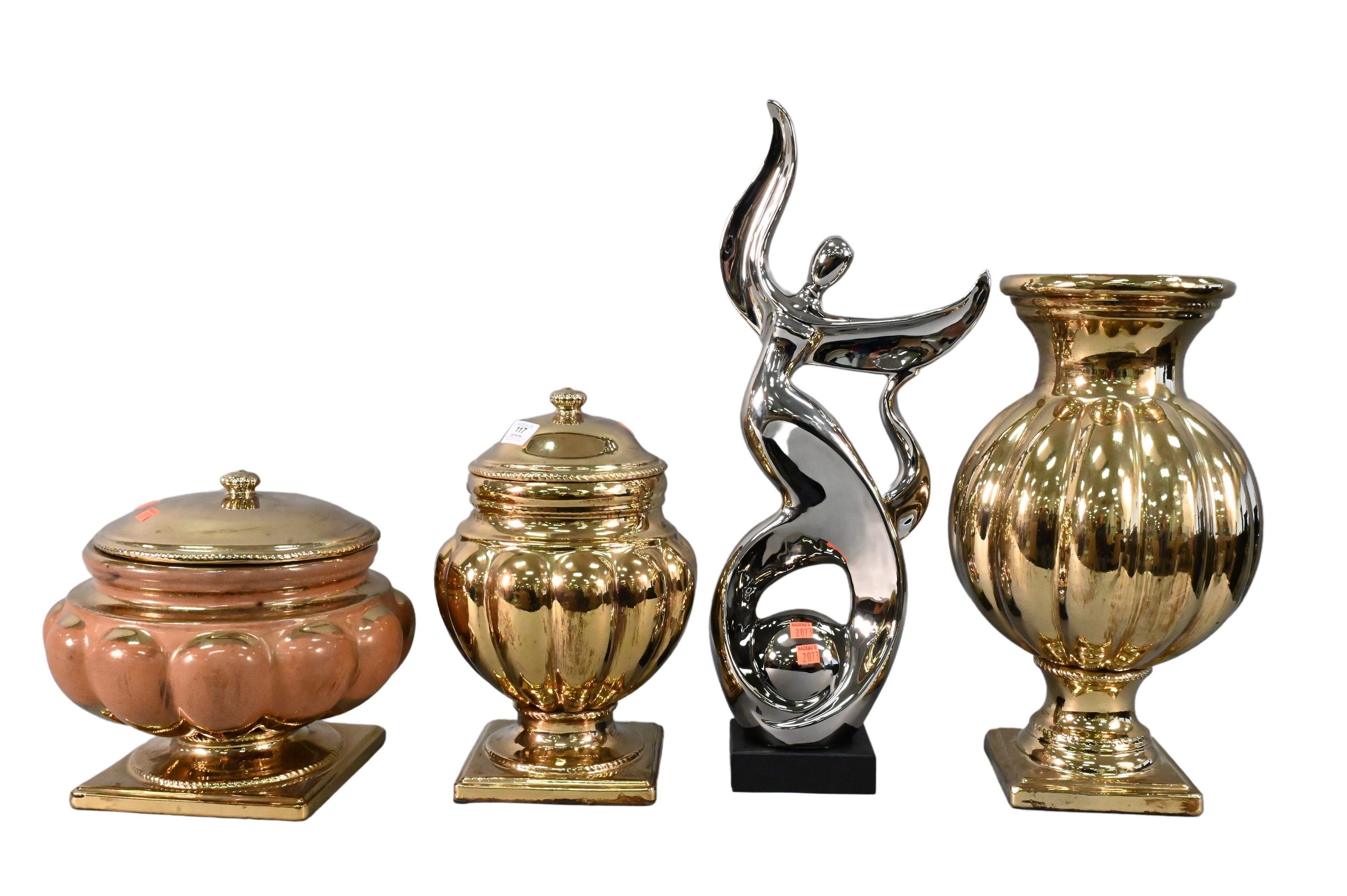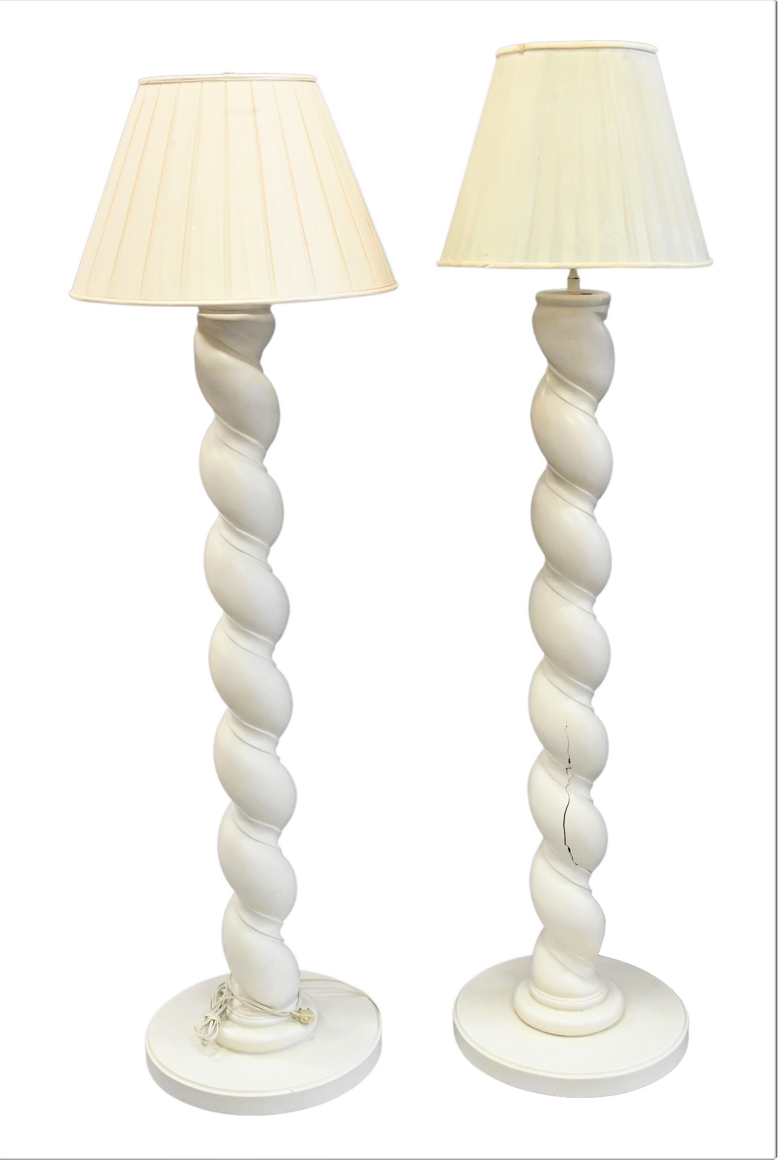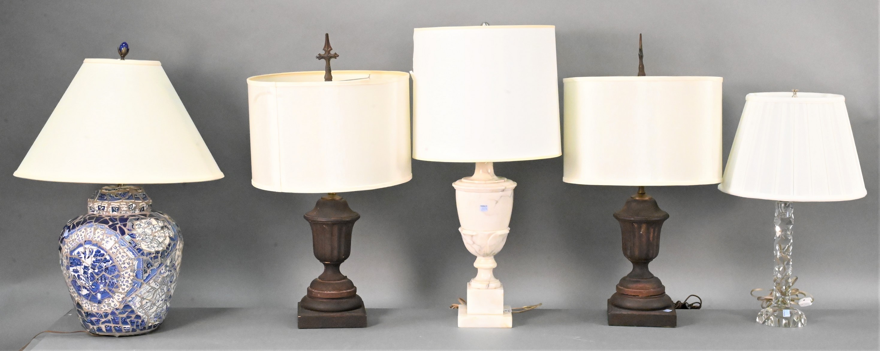 Group of Five Table Lamps, large white marble in the form of an urn, pair of iron urn form lamps, a cut glass stick lamp along with a blue and white mosaic tile lamp, tallest 20 1/2 inches.