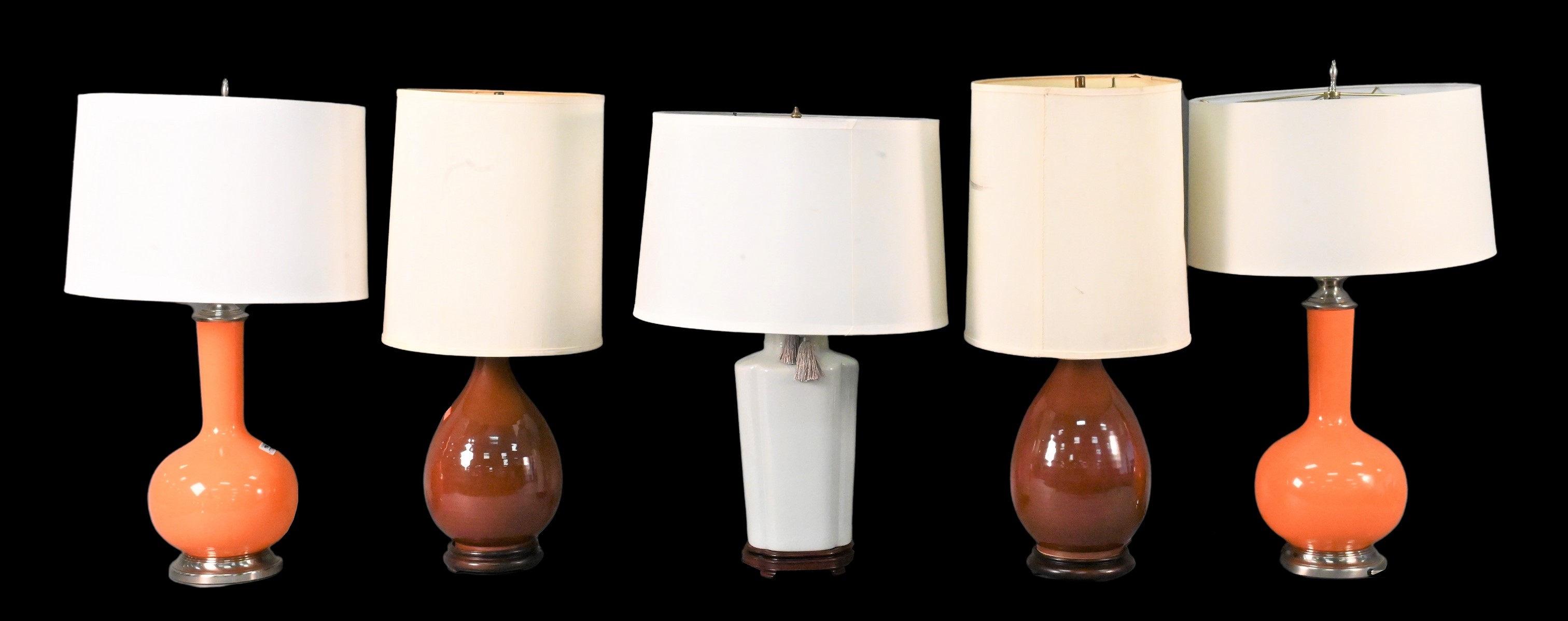 Group of Five Chinese Style Vase Table Lamps, to include a pair of red glazed bottle vases, a pair of orange bottle vases, along with a celadon crackle glaze, tallest 31 inches.