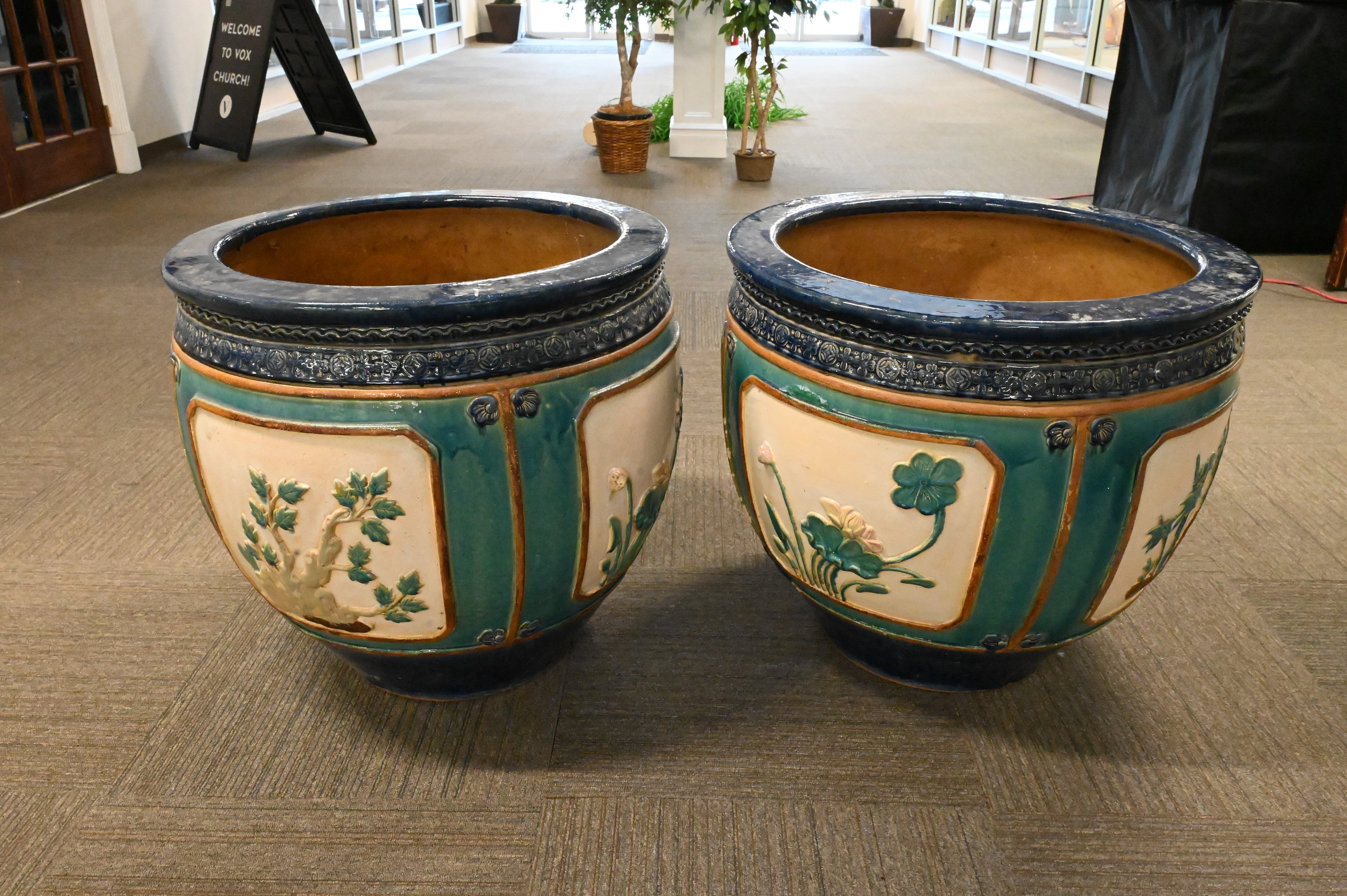 Pair of Outdoor Earthenware Planters, in the Chinese taste, height 27 inches, diameter 29 inches. Provenance: Property from a private New York collection sold to benefit charitable foundations.