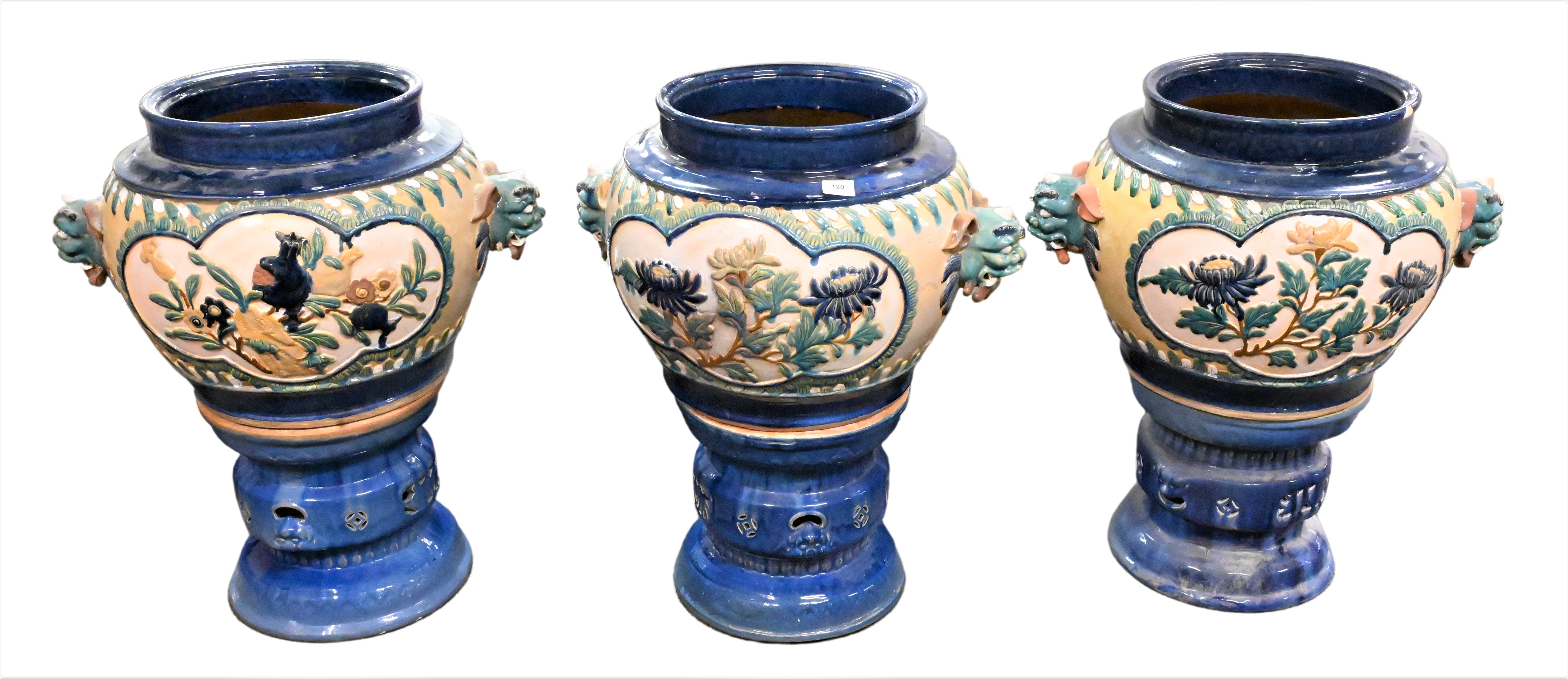 Set of Three Japanese Fishbowls, each having foo dog handles along with pedestal bases, cracks and chips throughout, height 29 inches, diameter 13 1/2 inches. Provenance: Property from a private New York collection sold to benefit charitable foundations.