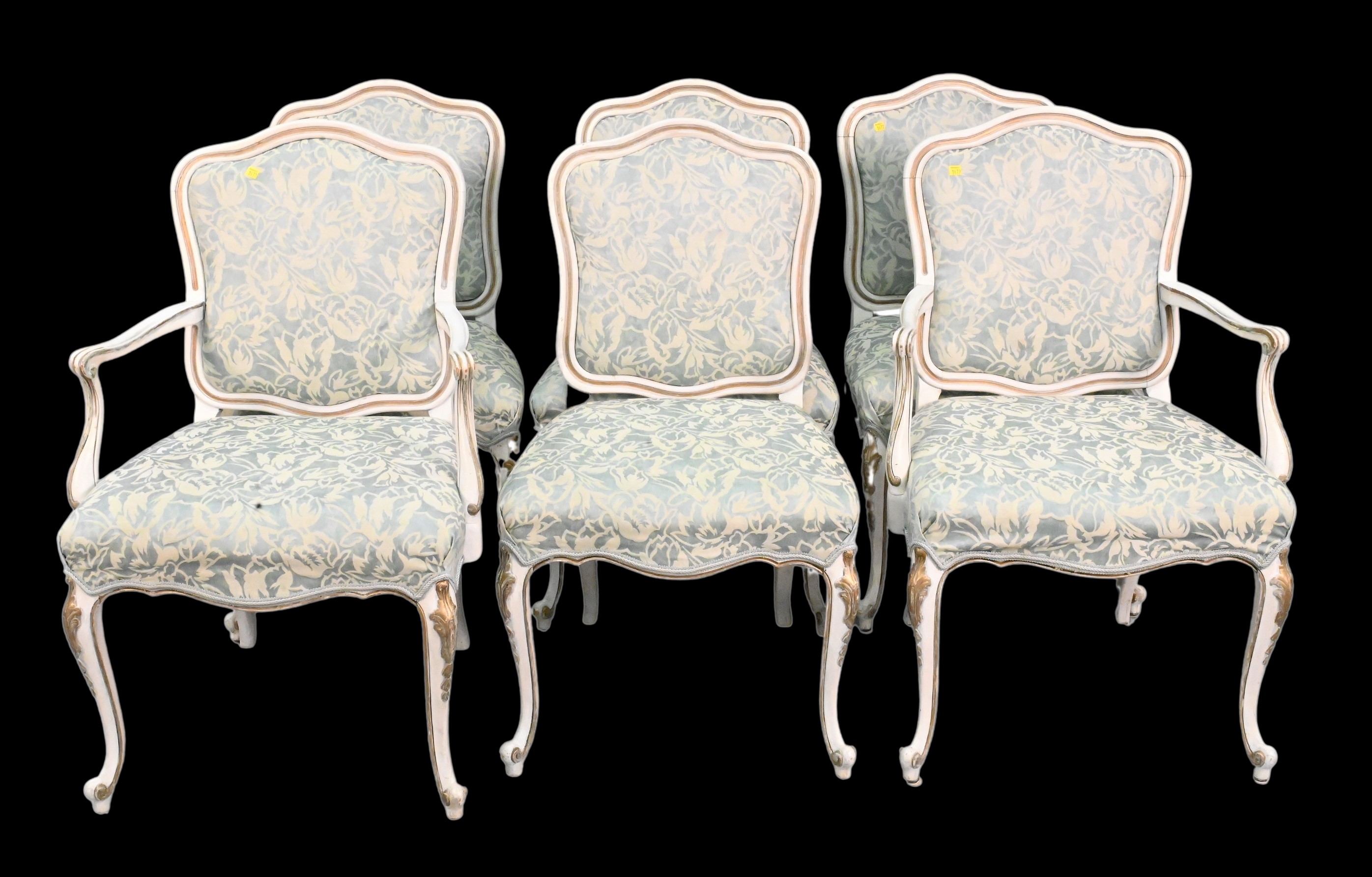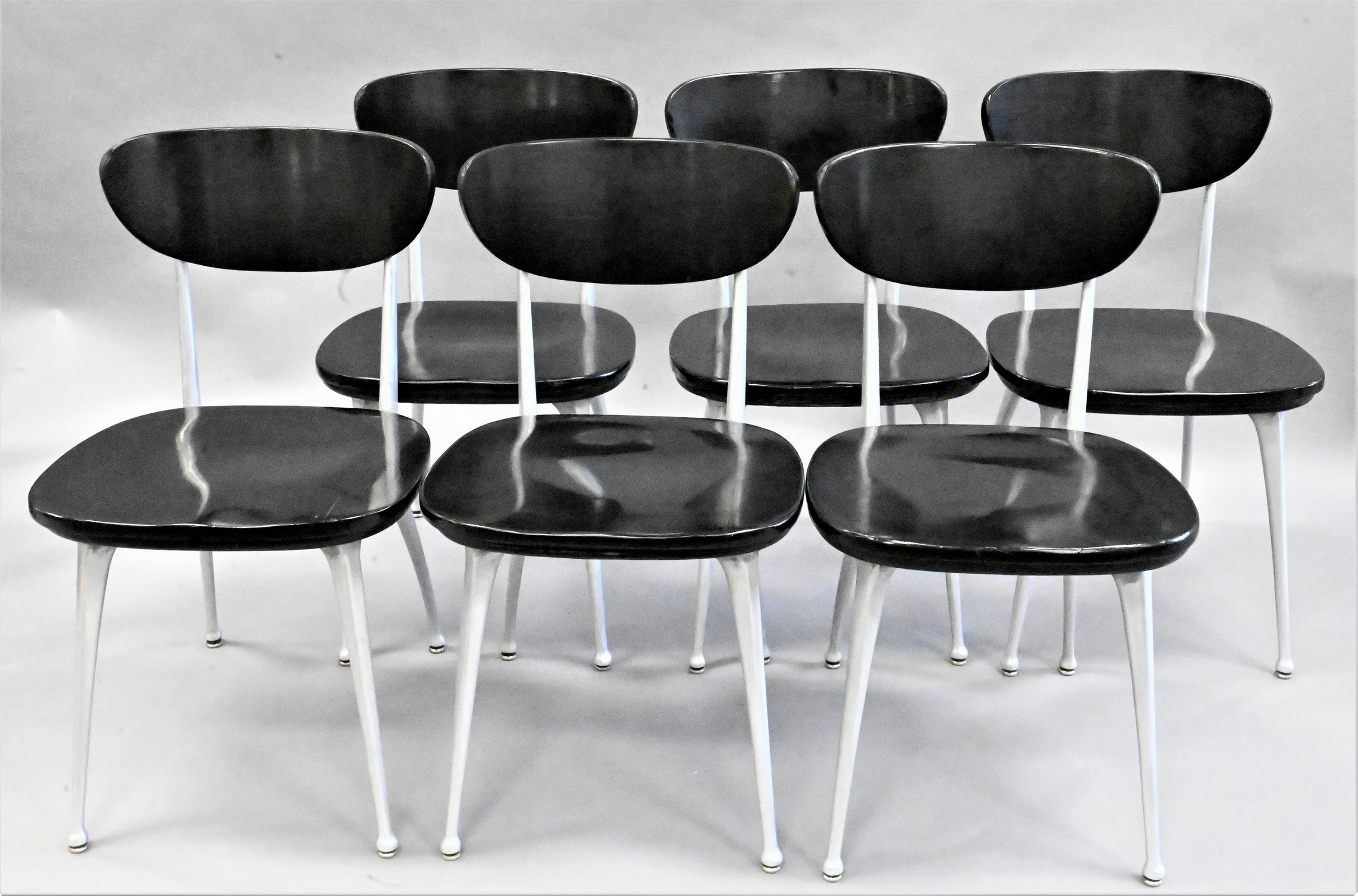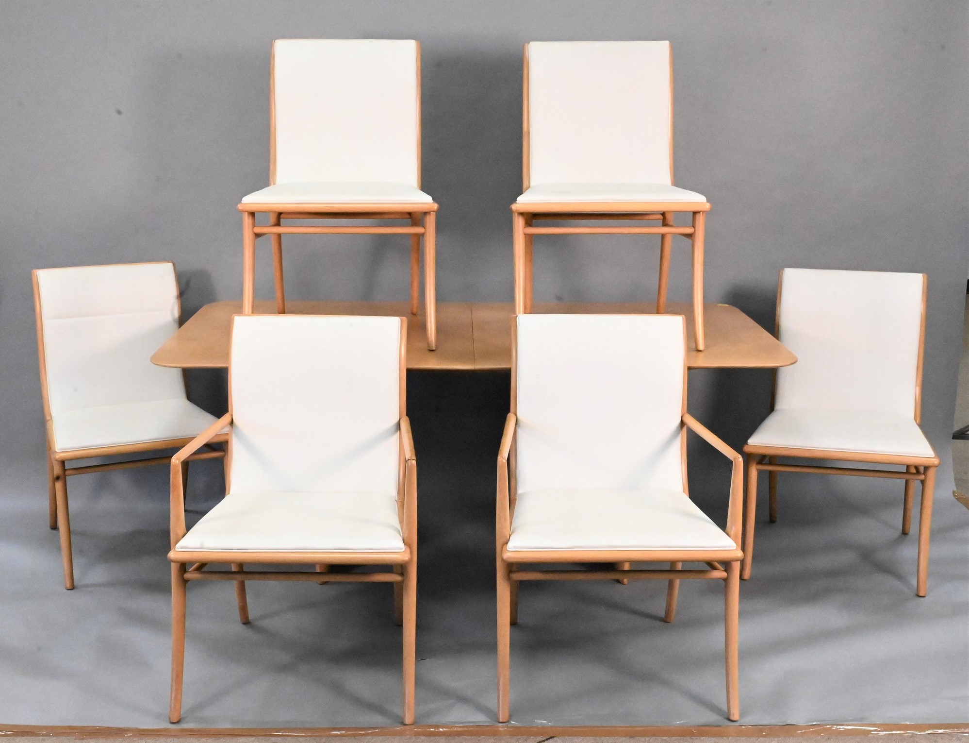 Seven Piece T.H. Robsjohn Gibbings Dining Set, to include two armchairs and four side chairs having sabre legs, a banded dining table, along with two 18 inch leaves, height 28 inches, top 69 1/2″ x 40″, open 105 1/2″ x 40″.