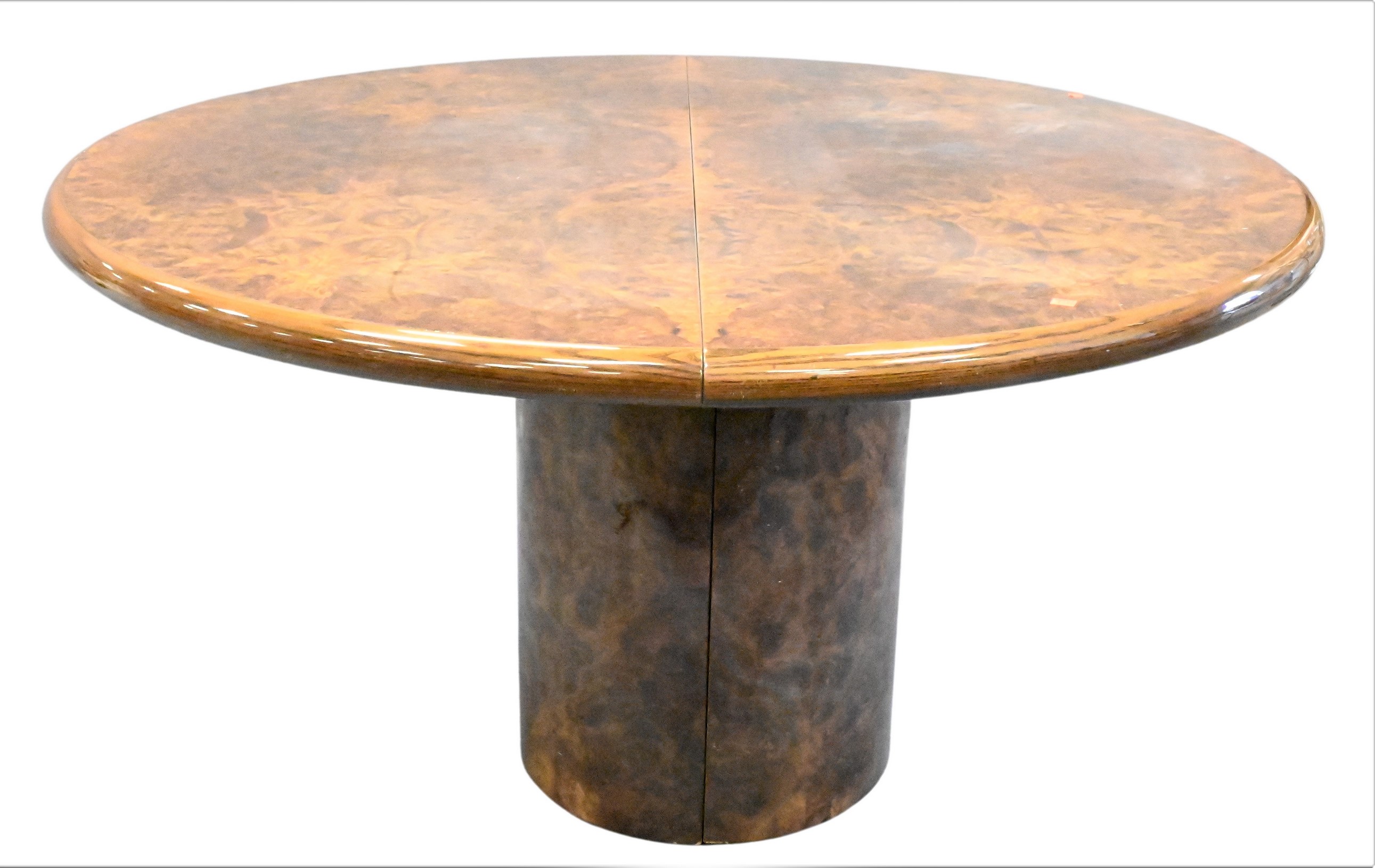 Round Dining Table, having burlwood veneer top and oak edge on matching pedestal (no extension leaves), height 29 1/2 inches, diameter 53 inches. Provenance: Property from a private New York collection sold to benefit charitable foundations.
