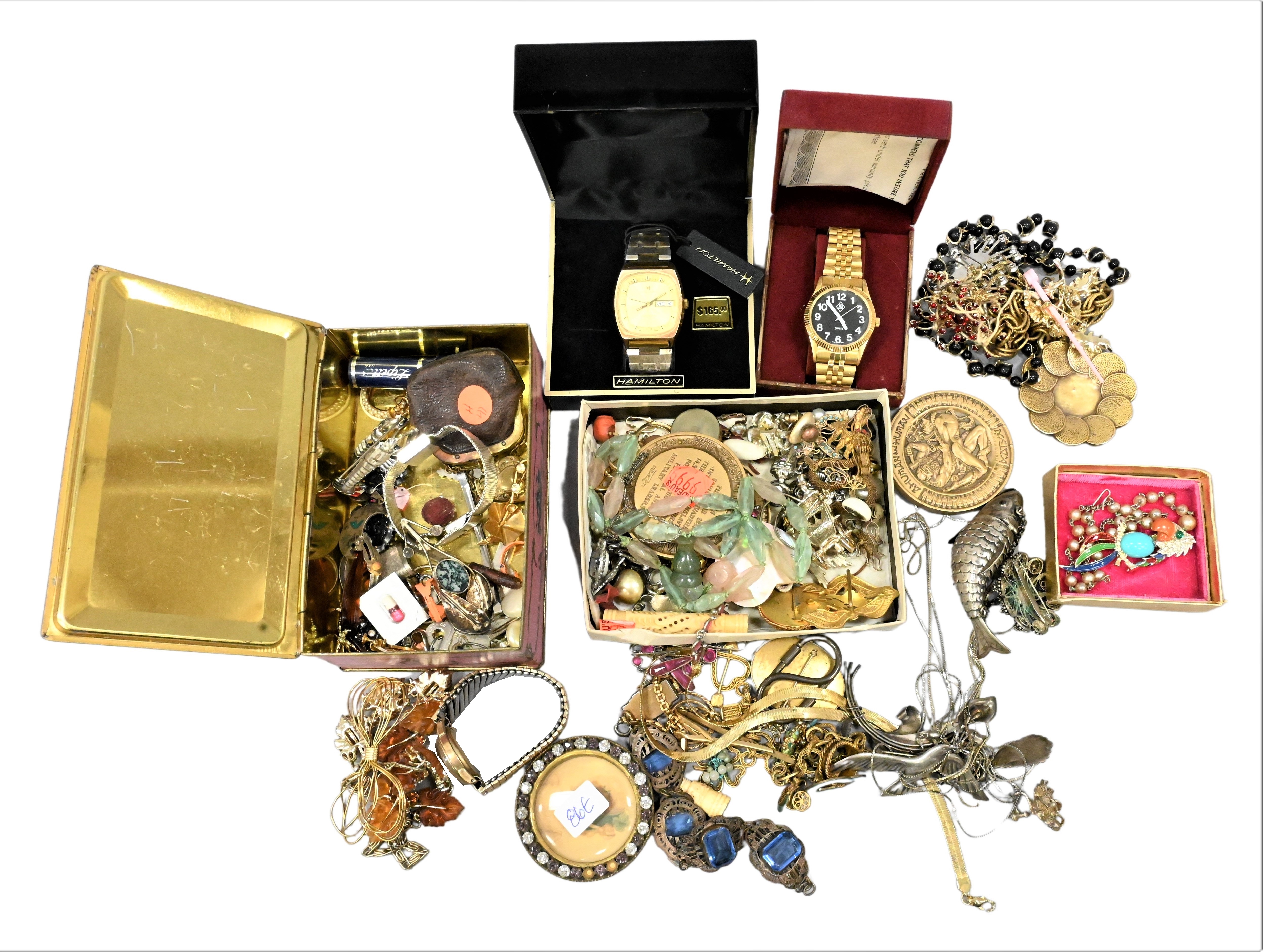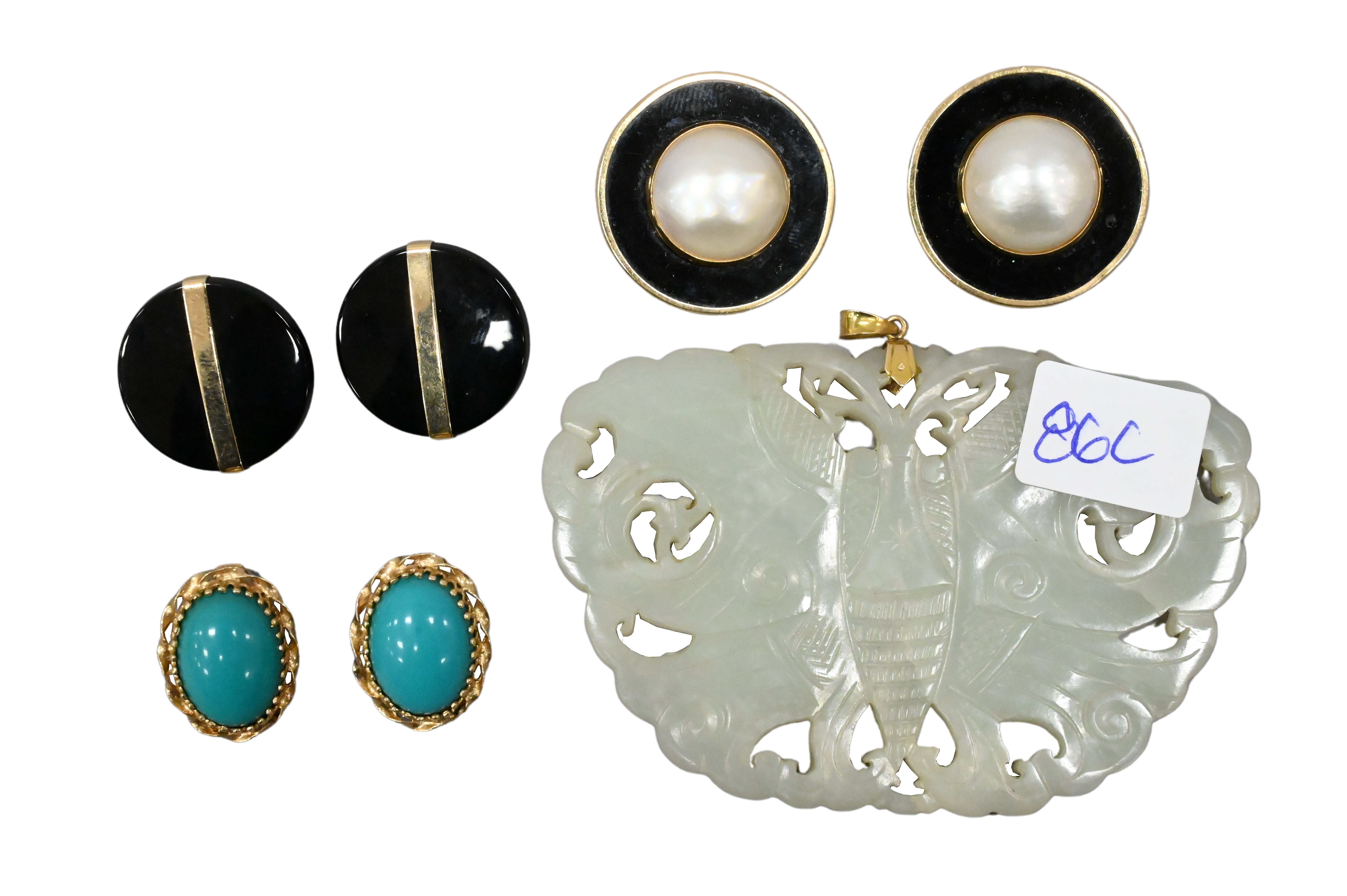 Three Pairs of Gold Mounted Clip on Earrings, along with carved white jade butterfly. Provenance: Property from a private New York collection sold to benefit charitable foundations.