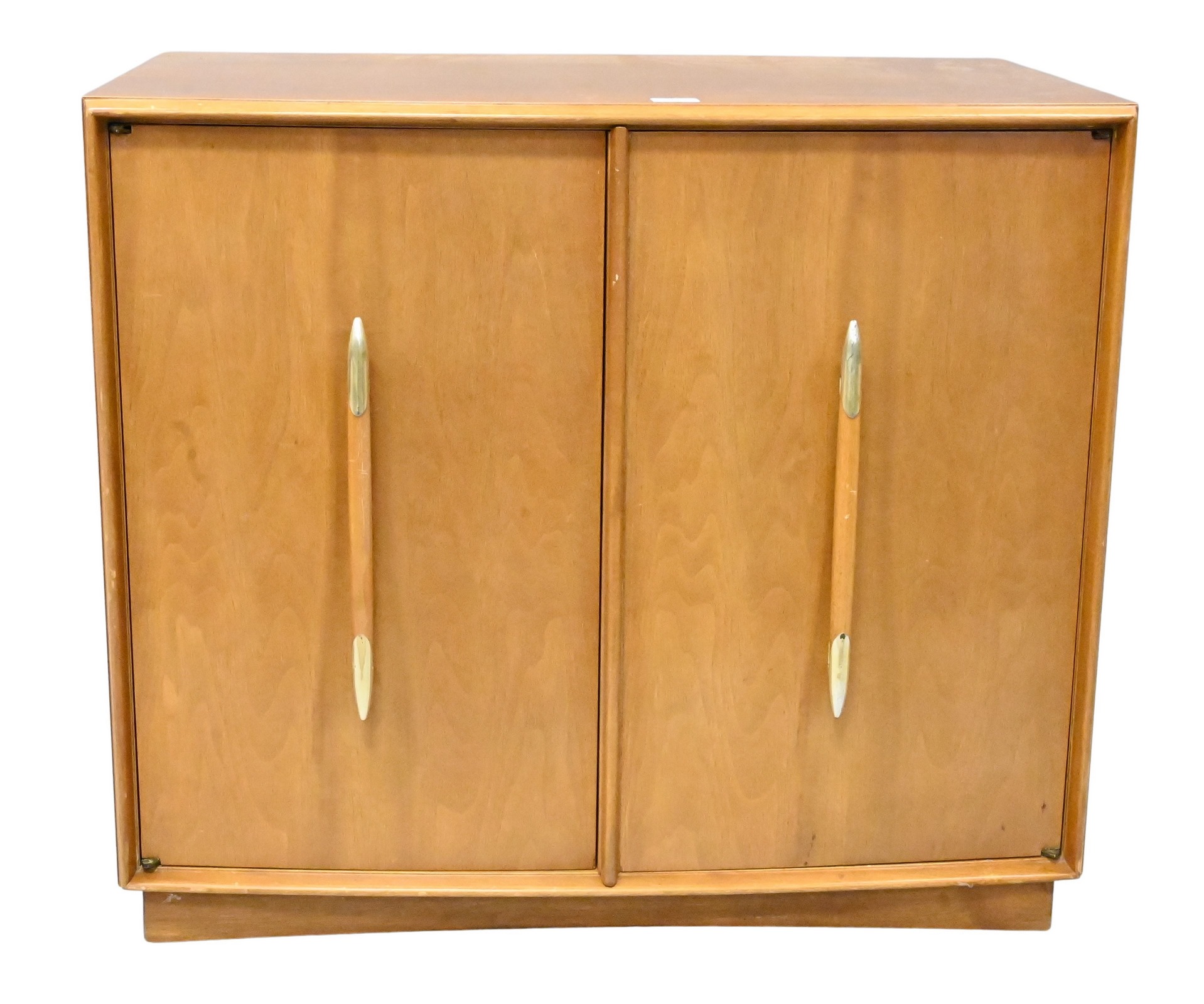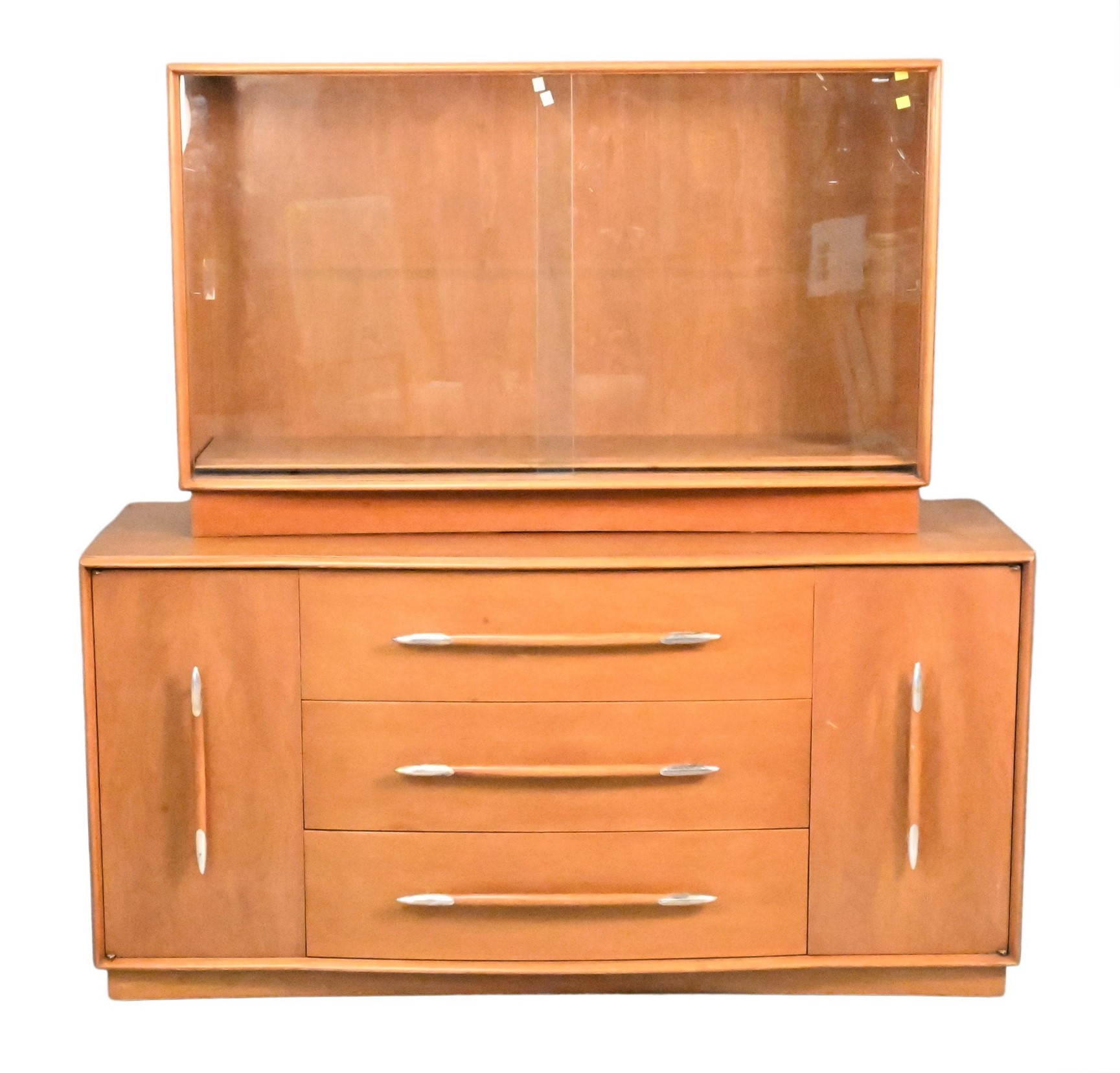 T.H. Robsjohn Gibbings Server by Widdicomb, having sliding glass door, top with concave base having three drawers flanked by two doors, height 61 inches, width 60 inches.