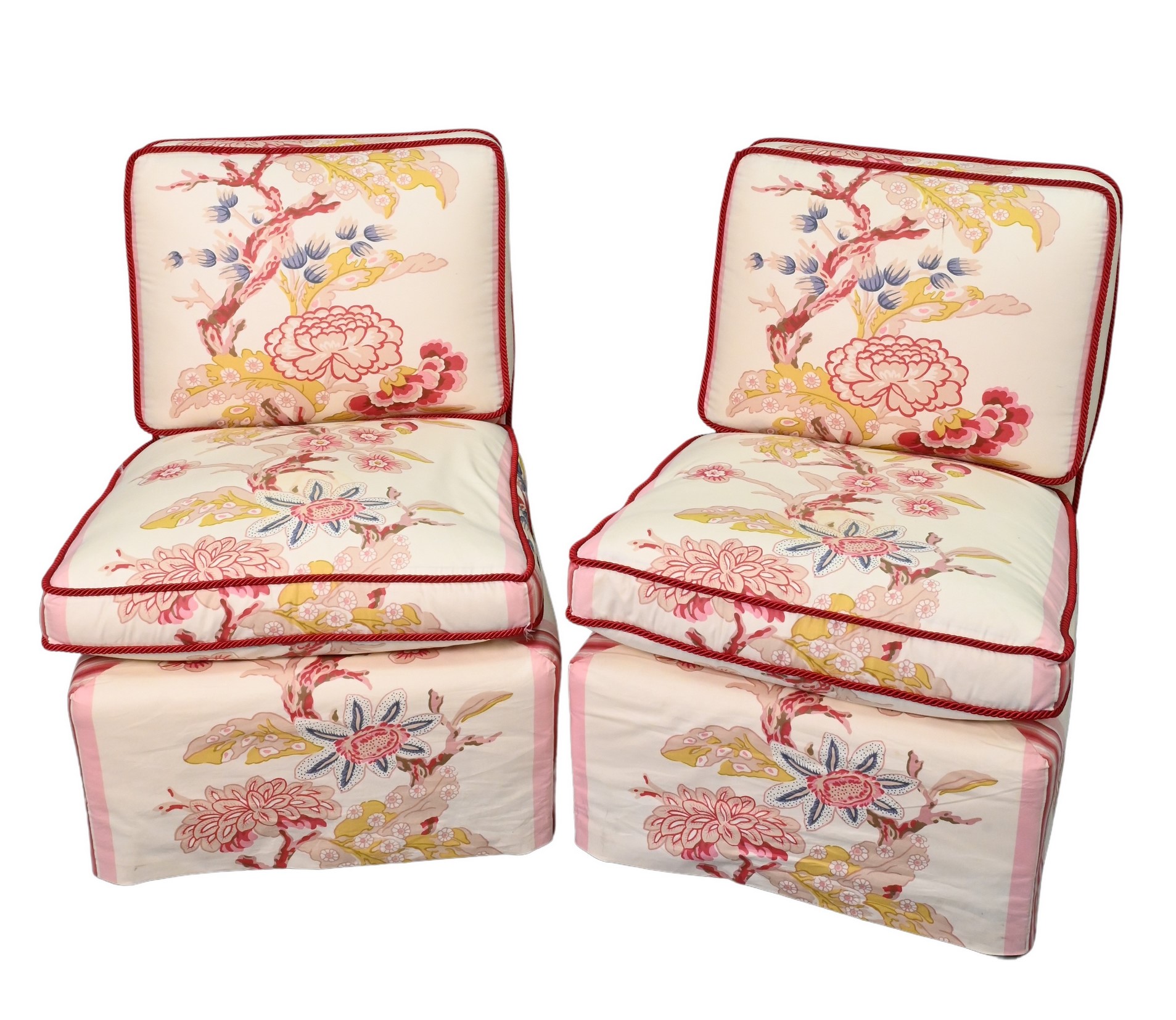 A Pair of Custom Chintz Upholstered Slipper Chairs, attributed to Billy Baldwin, having floral upholstered down filled cushion, height 28 1/2 inches, width 21 inches, depth 27 inches. Provenance: Property from a private New York collection sold to benefit charitable foundations.