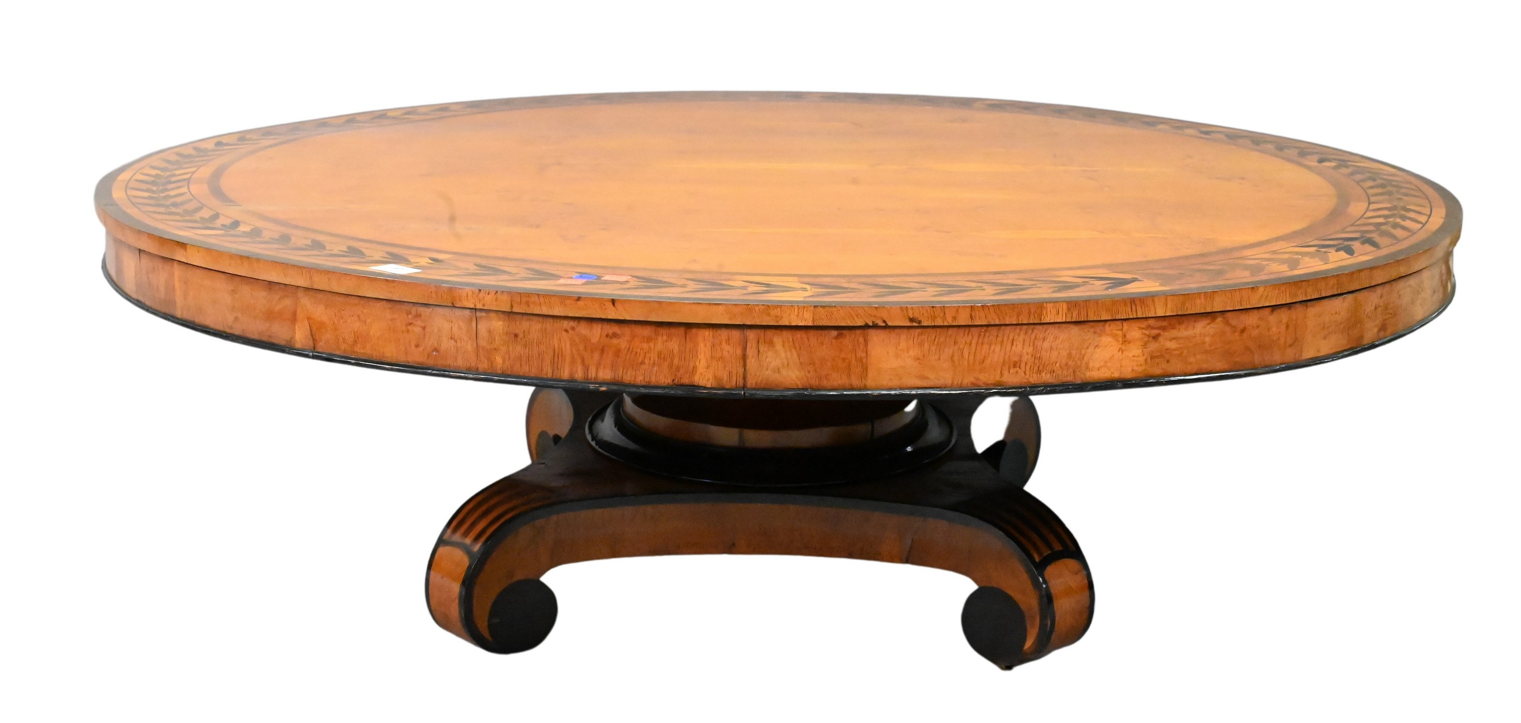 Round Oak Table, having inlaid border on pedestal base, height 18 inches, diameter 54 inches. Provenance: Property from a private New York collection sold to benefit charitable foundations.