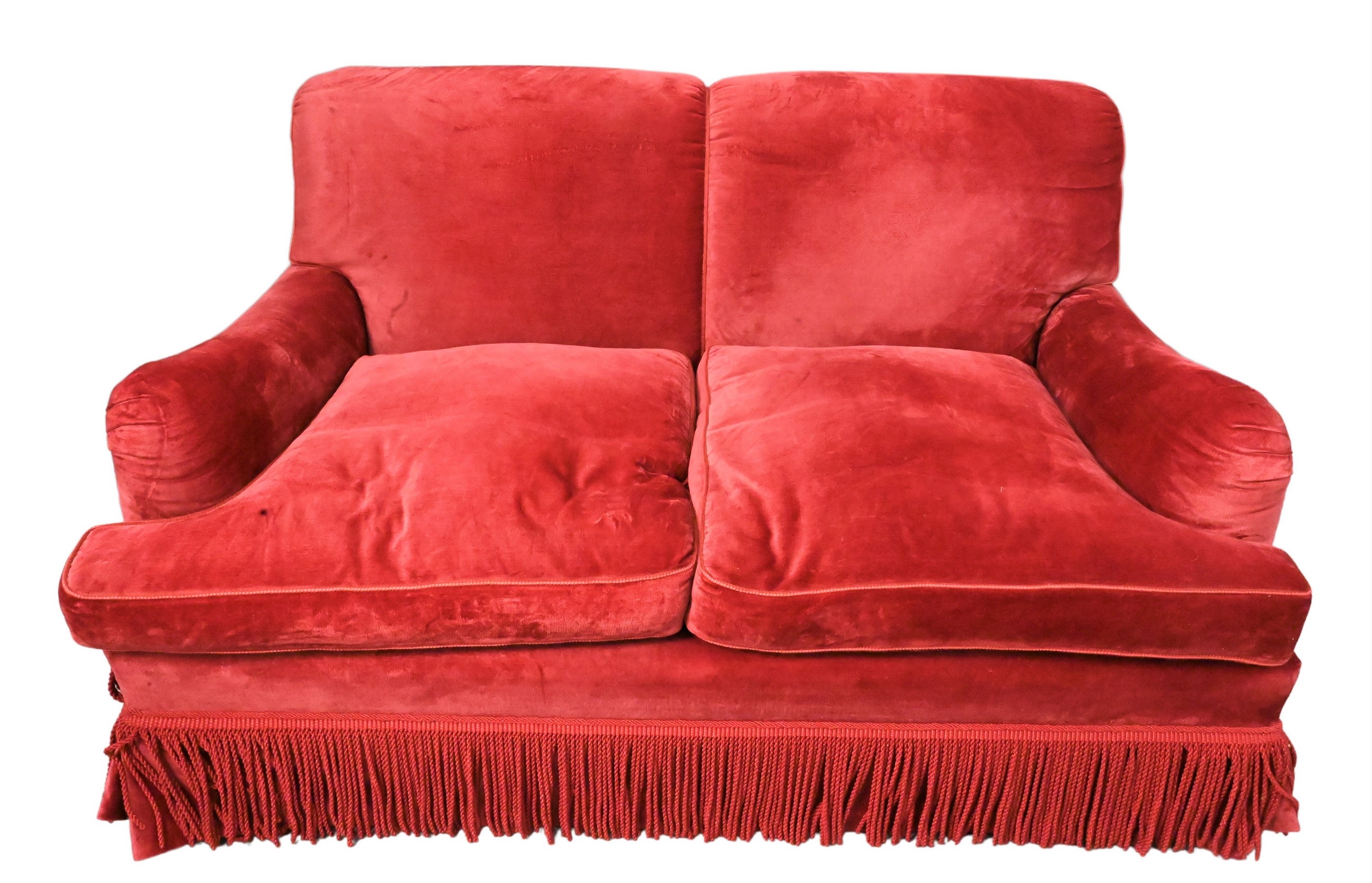 A Pair of Upholstered Loveseats, in red wine colored upholstery, clean condition, length 60 inches. Provenance: Property from a private New York collection sold to benefit charitable foundations.