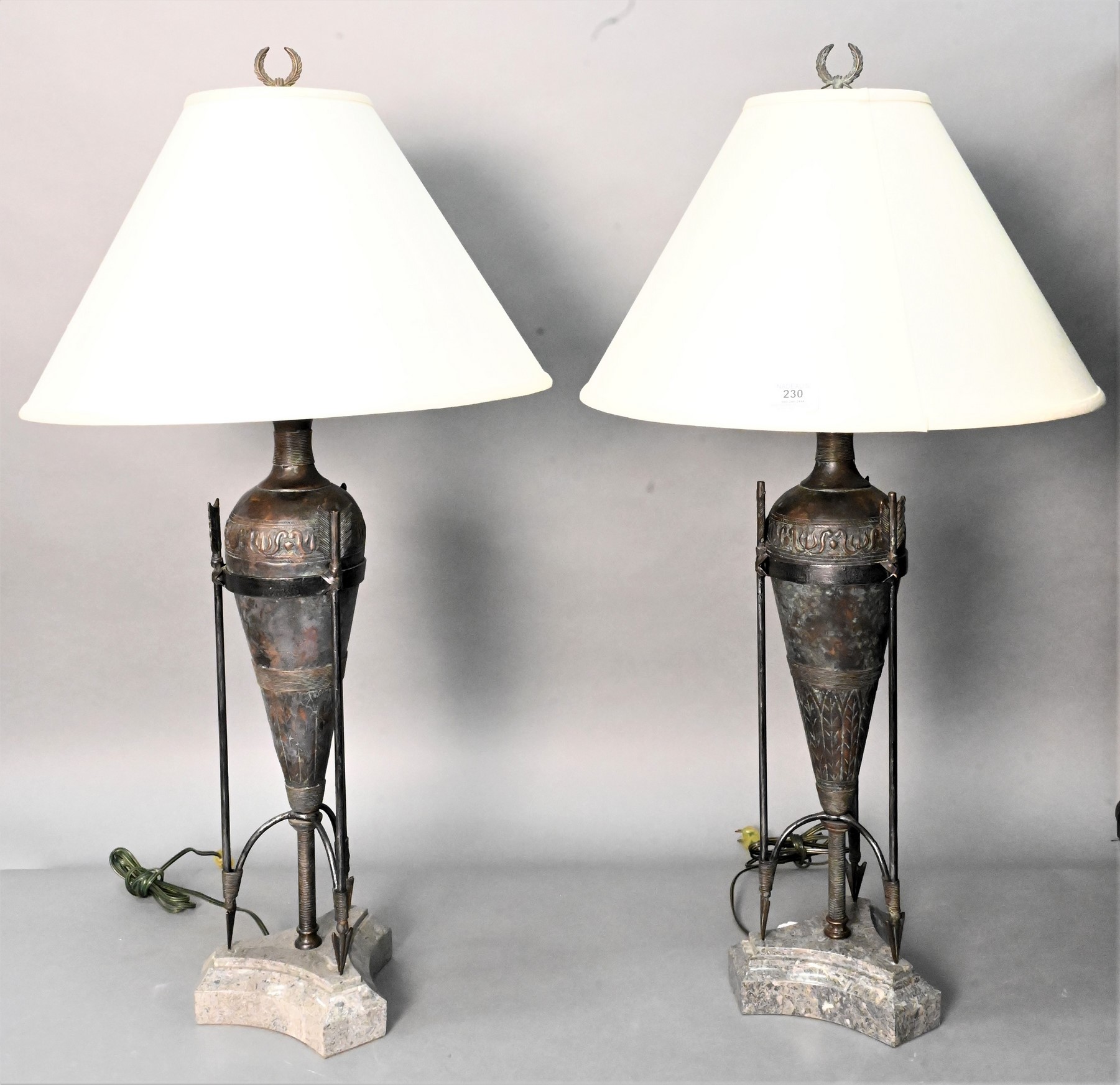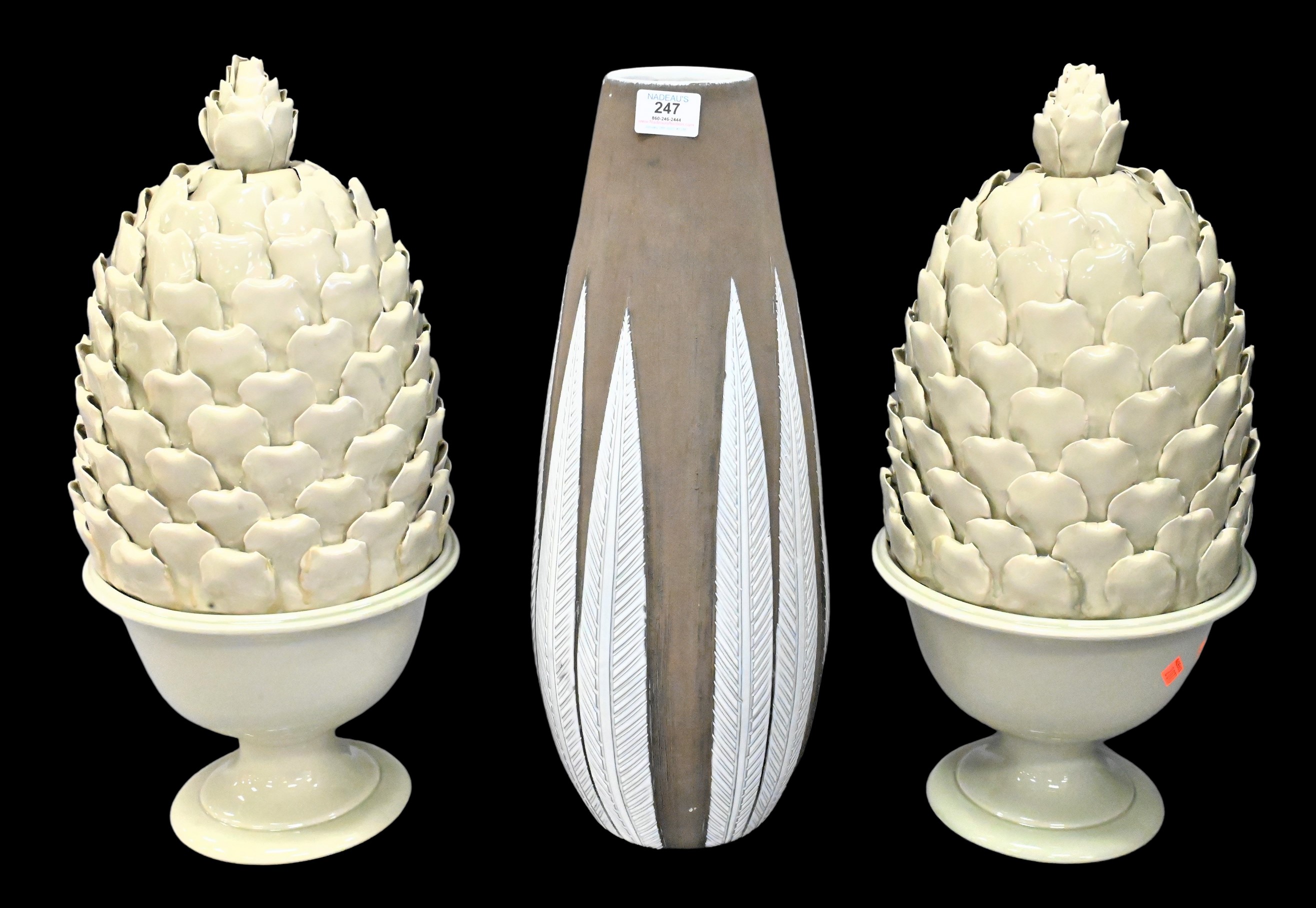 Three Piece Group, to include a pair of Global Views green glazed ceramic artichoke covered urns; along with a Swedish brown ceramic vase having white glazed leaves, height 21 inches, marked on bottom, (chipped).