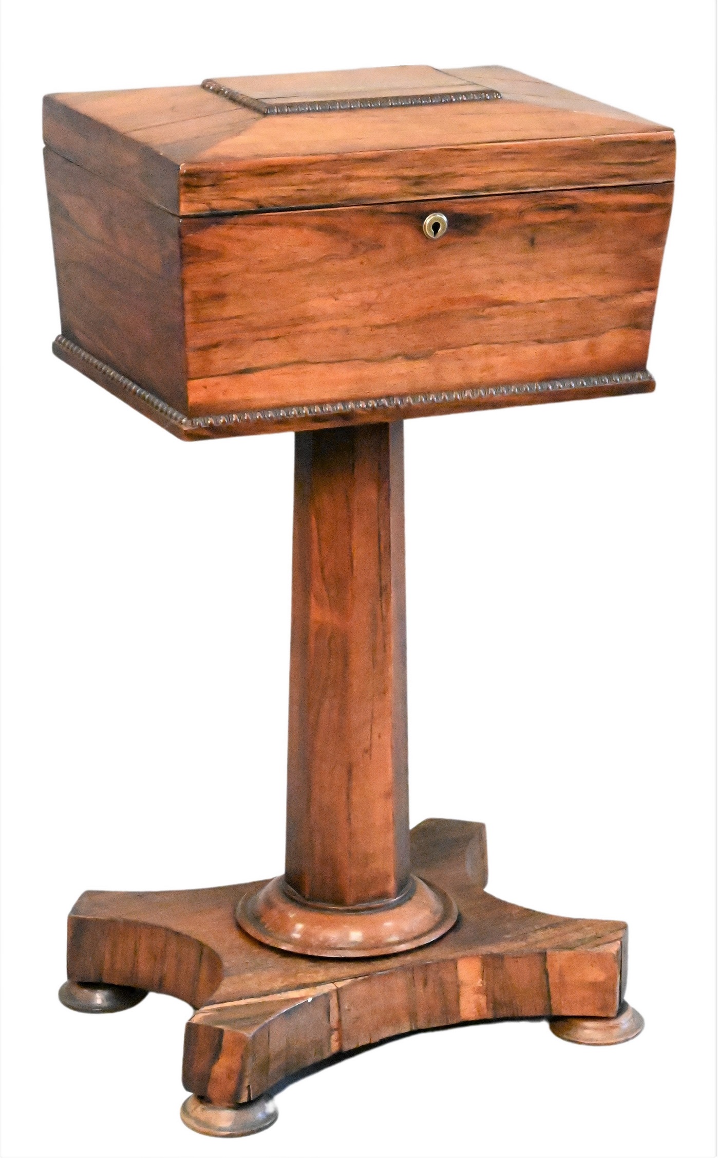 William IV Rosewood Teapoy, having coffer-form case and hinged lid over a paneled stem on quadripartite base and disc feet, overall poor condition, the top sun faded with age crack and water damage, the base with sun fading, age cracks and veneer loss, height 30 inches, width 17 inches, depth 13 inches. Provenance: Property from a private New York collection sold to benefit charitable foundations.