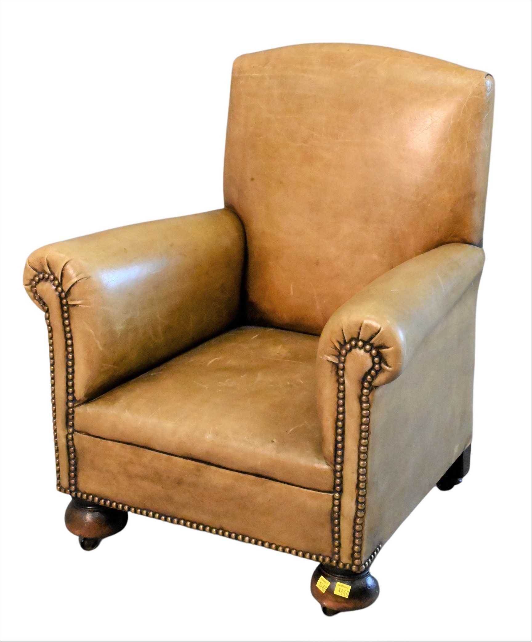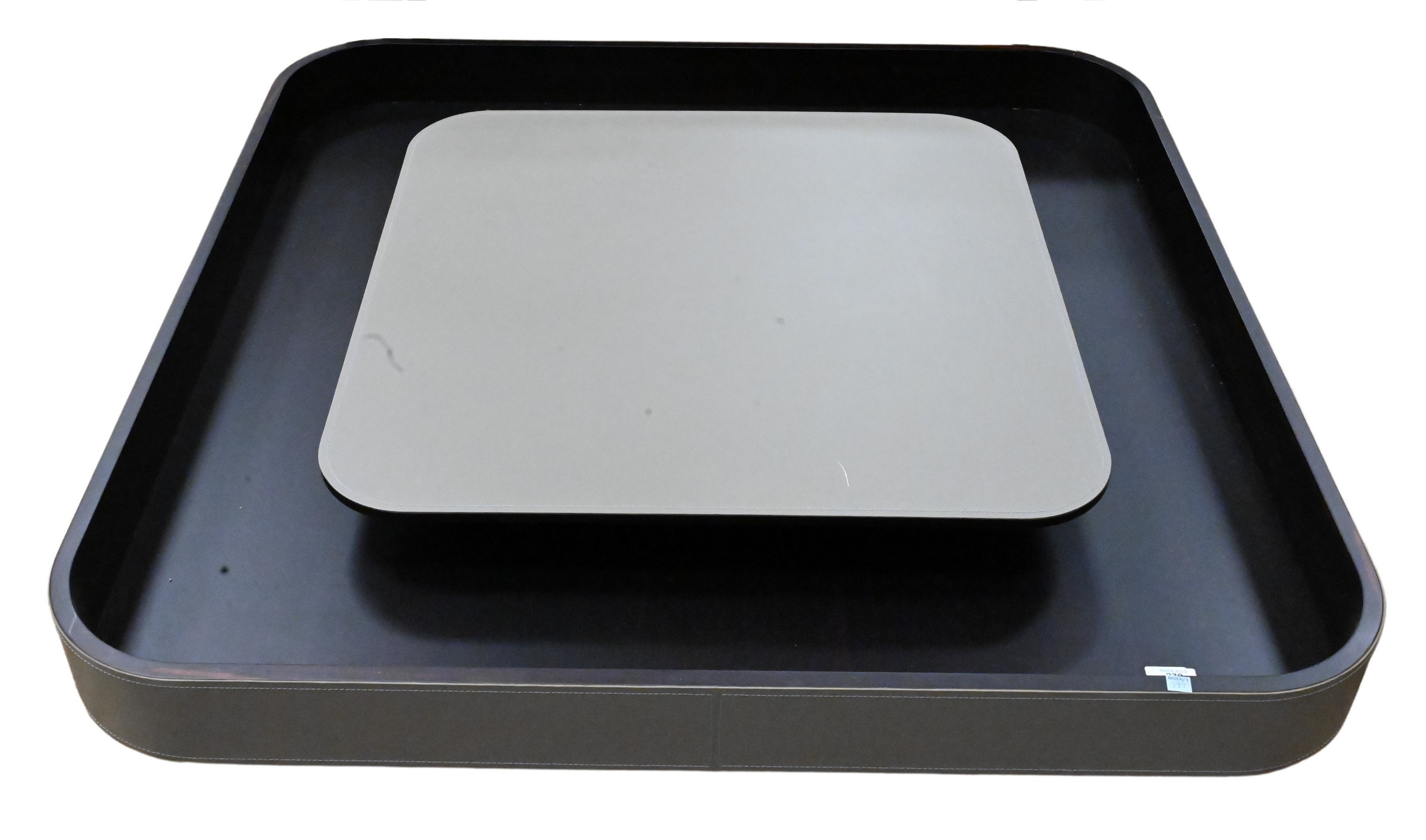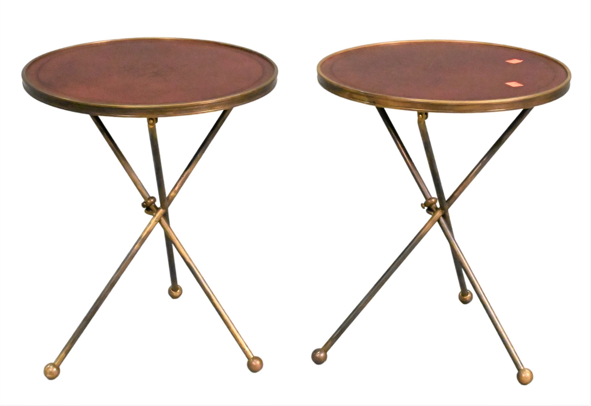 A Pair of Leather, Steel and Brass Occasional Tables, circular top raised on three splay folding legs on ball feet, attributed to Gaspare Asaro, height 17 1/2 inches, diameter 14 1/4 inches.