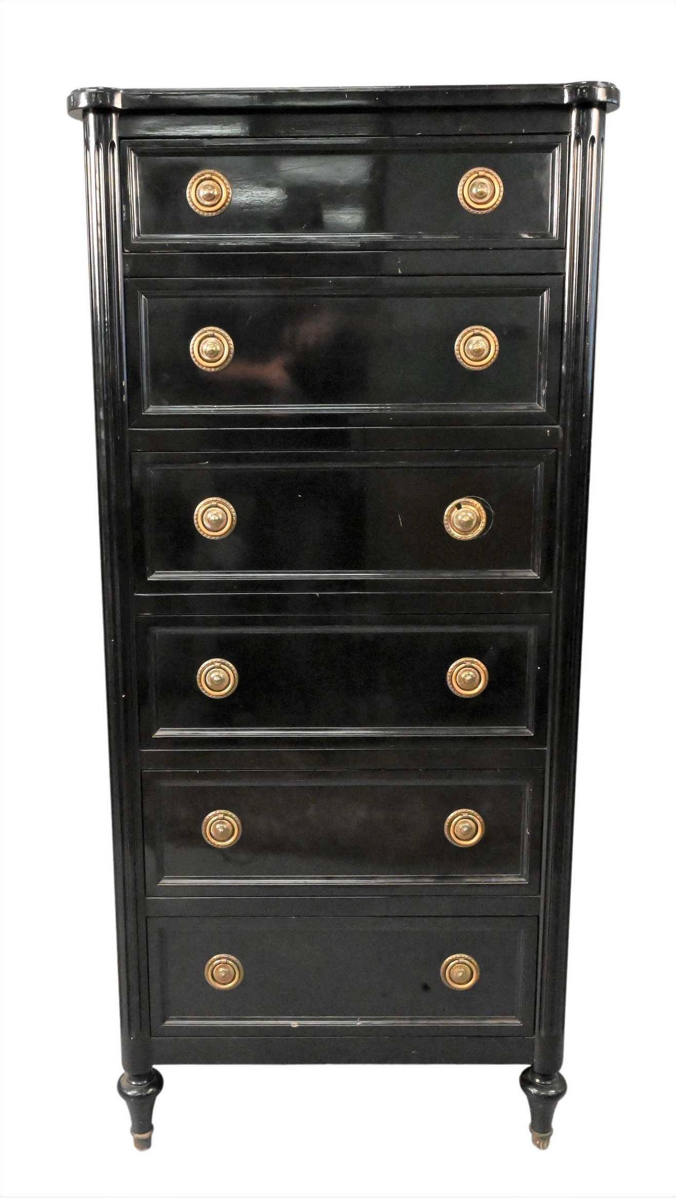 Six Drawer Black Lacquer Lingerie Chest Maison Jansen Style, height 57 inches, width 25 inches. Provenance: Property from a private New York collection sold to benefit charitable foundations.
