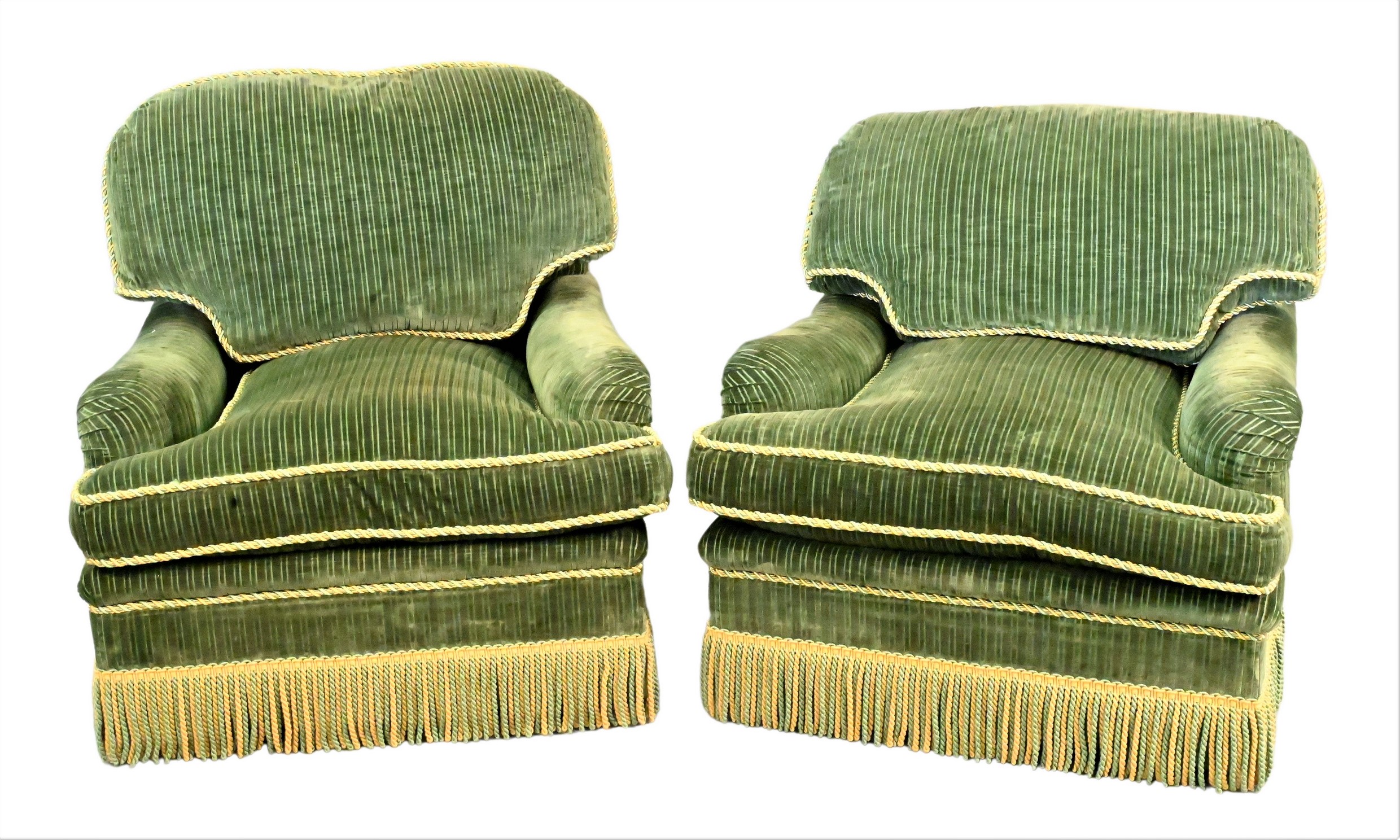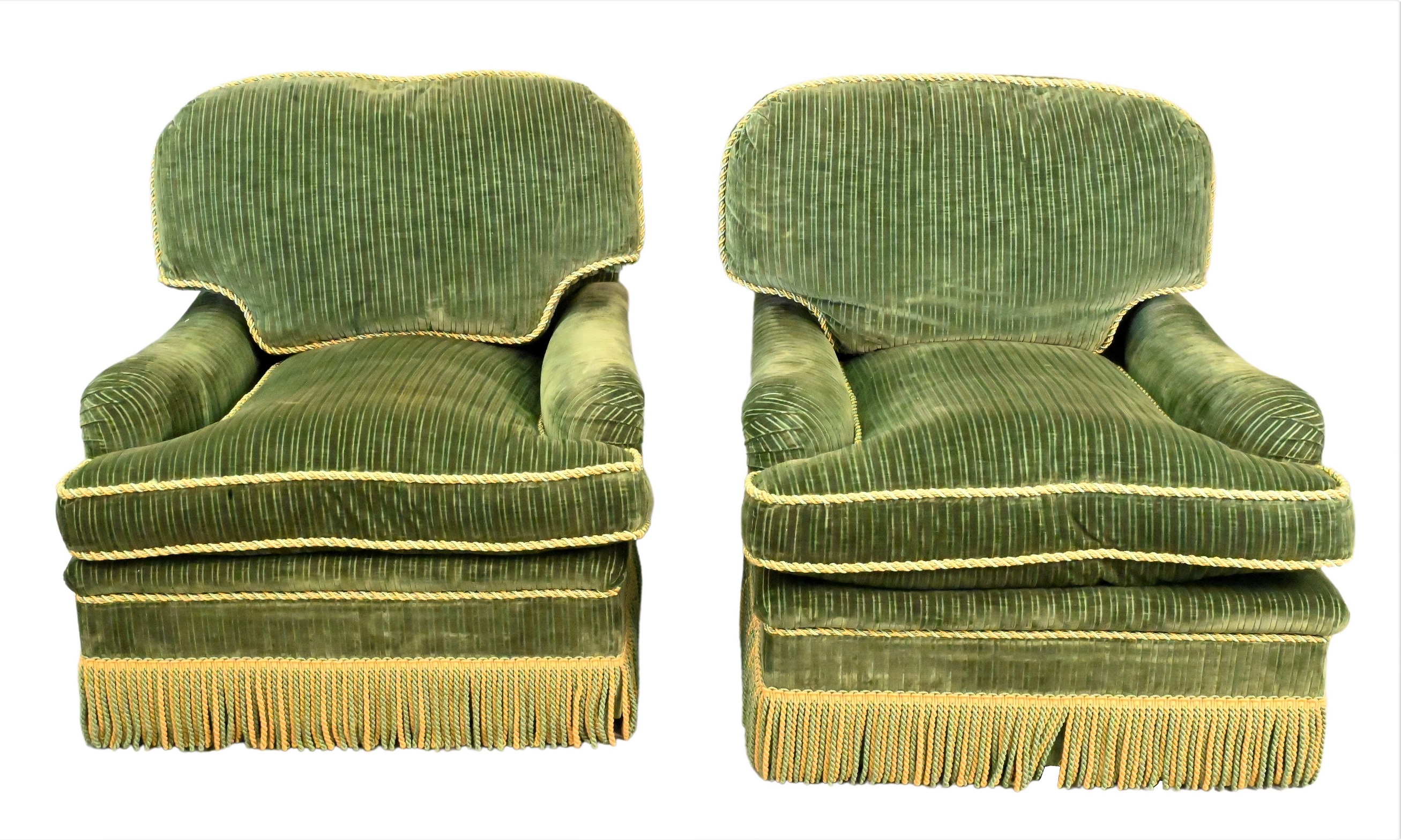 A Pair of Contemporary Green Velour Upholstered Swivel Club Chairs, supplied by Thomas Britt, late 20th century, covered in a ribbed green velvet with green and gold silk rope seams and tassels, height 32 inches, width 39 inches, depth of each 39 inches. Provenance: Property from a private New York collection sold to benefit charitable foundations.