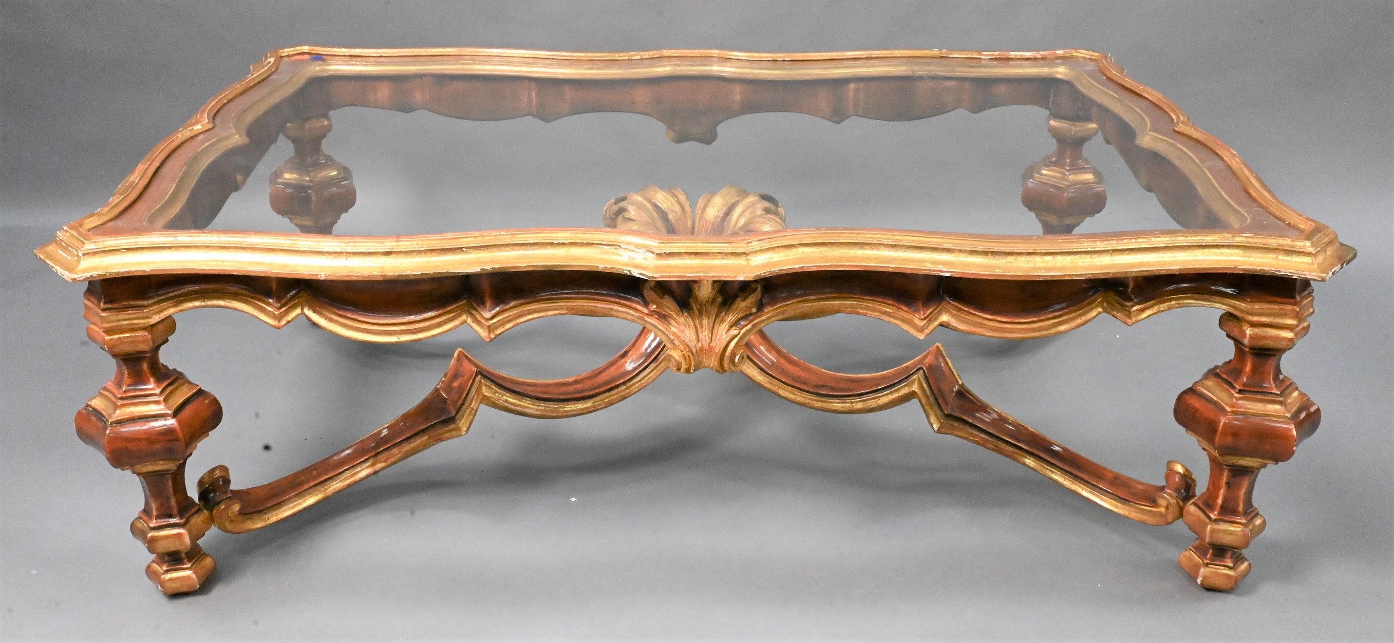 A Baroque Style Grain-Painted and Parcel Gilt Glass Top Low Table, plate glass top having scalloped sides over a conforming base with hexagonal, inverted trumpet-form legs and a shaped X-stretcher, 20th century, height 17 1/2 inches, width 52 inches, depth 32 1/2 inches. Provenance: Property from a private New York collection sold to benefit charitable foundations.