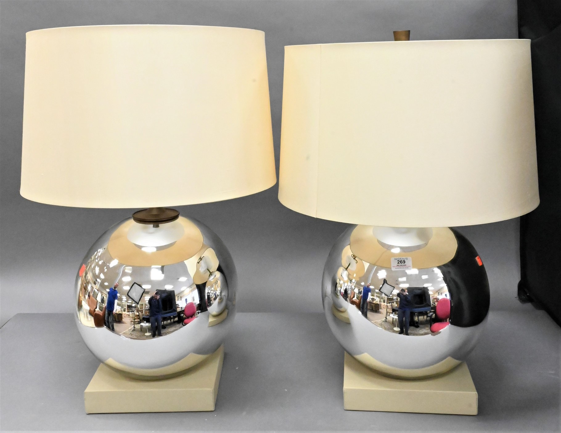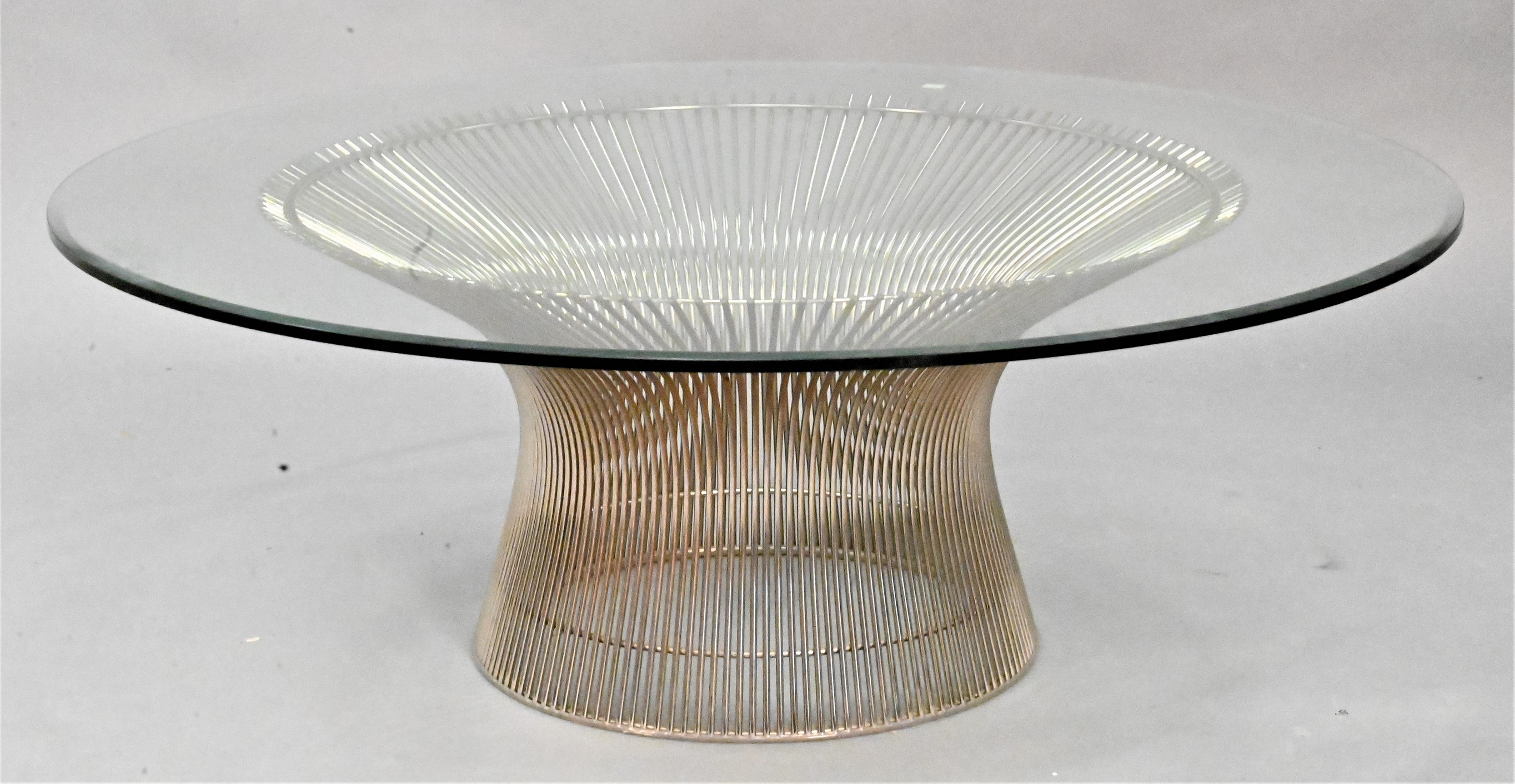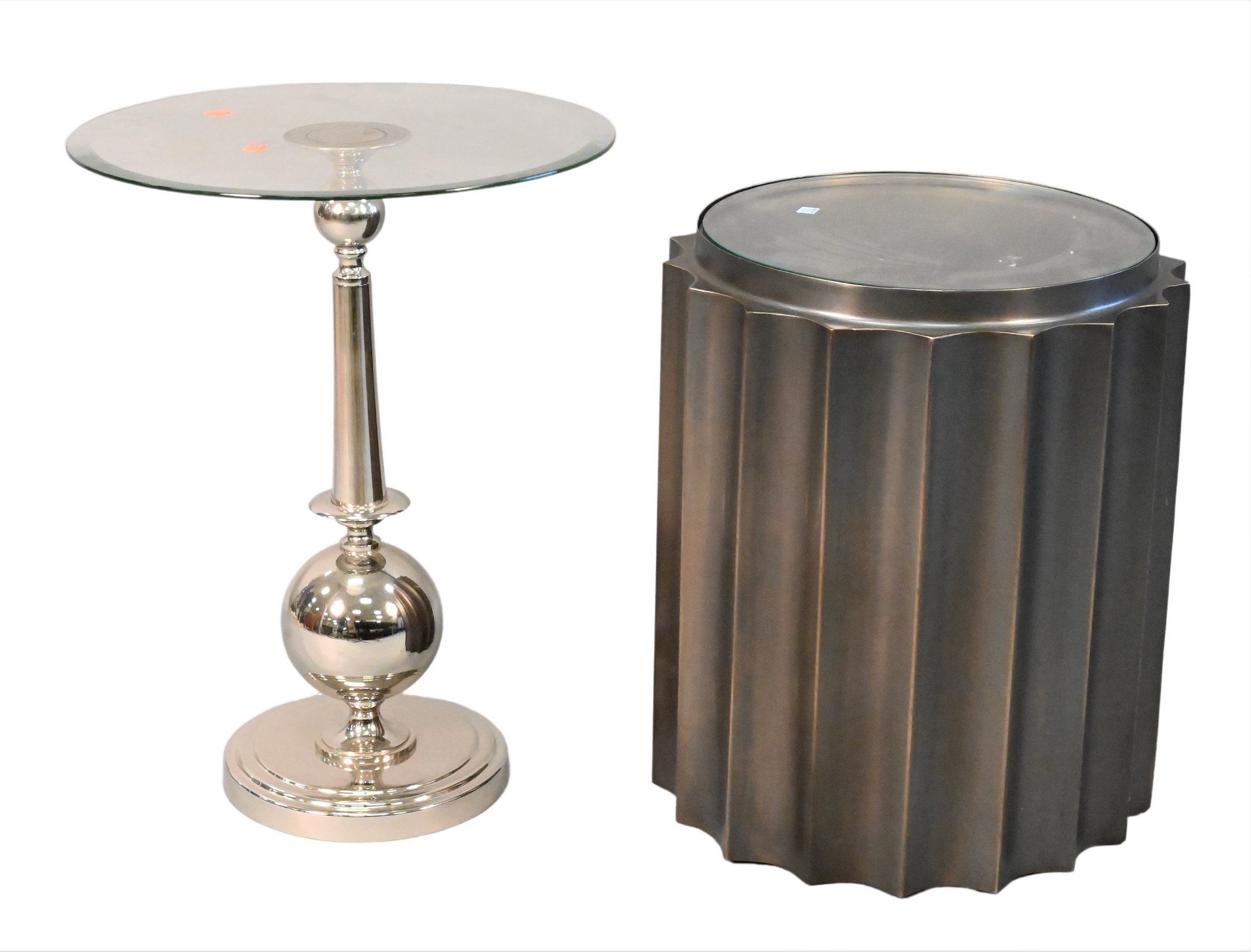 Two Piece Lot, to include a fluted side table, antique bronze finish, in the form of a drum with glass top, Global Views; along with a glass top chrome table, height 21 1/2 inches, diameter 16 inches.