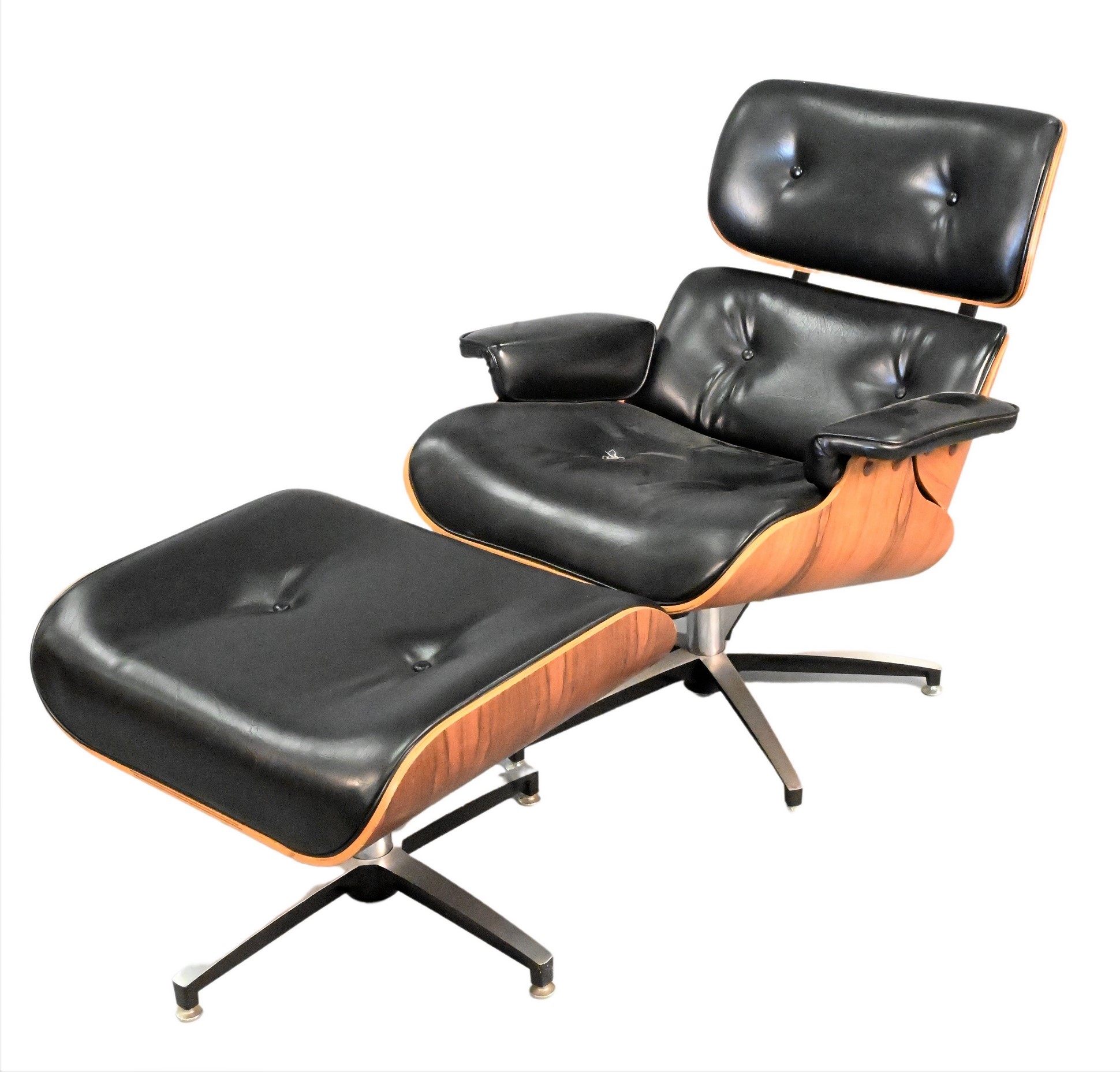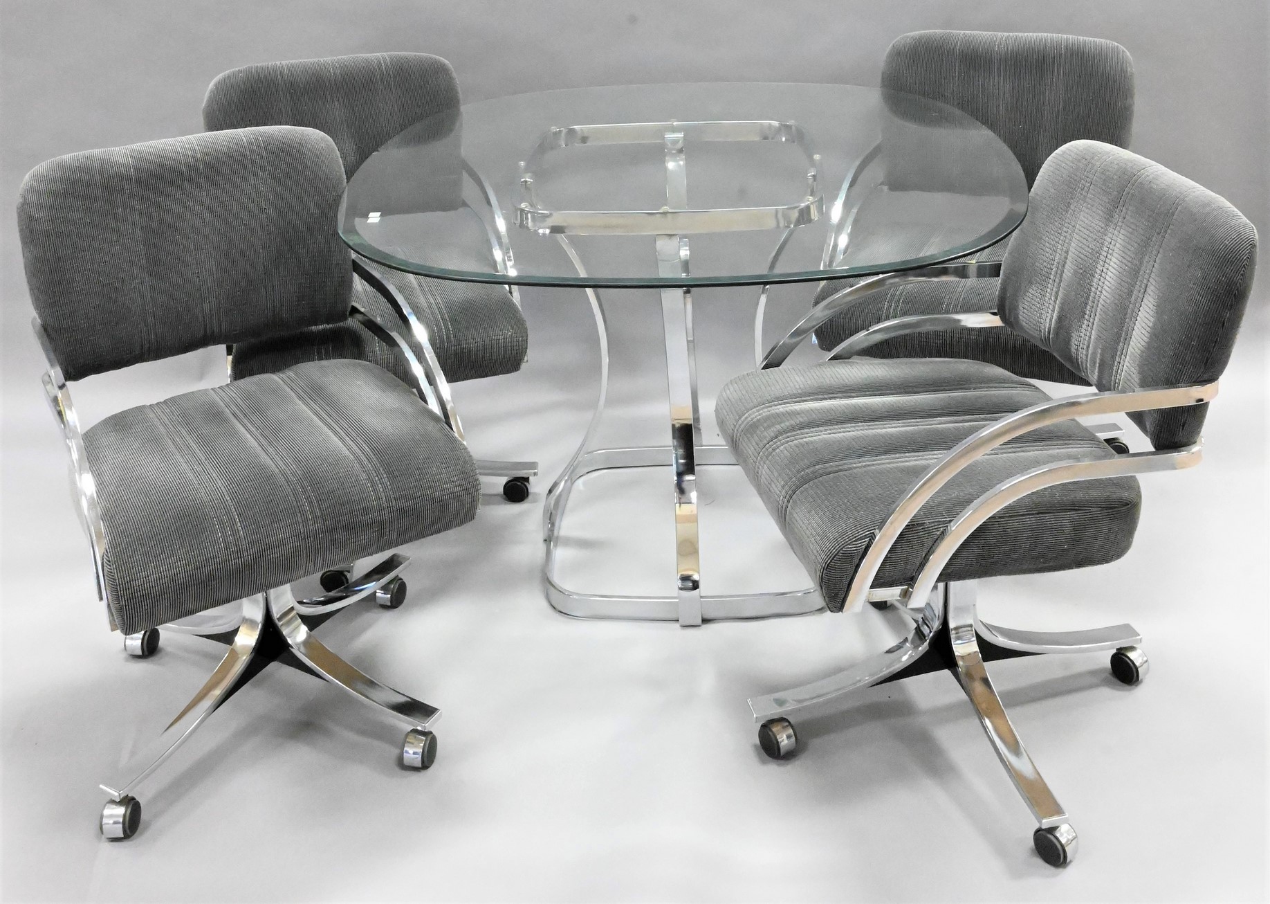 Five Piece Chrome Mid Century Modern Dinette Set, to include four Daystrom swivel dining chairs, having upholstered seats and chrome frames; a glass top table, height 28 3/4 inches, top 45″ x 45″, along with a mid century modern teak pole lamp having two hanging lights.
